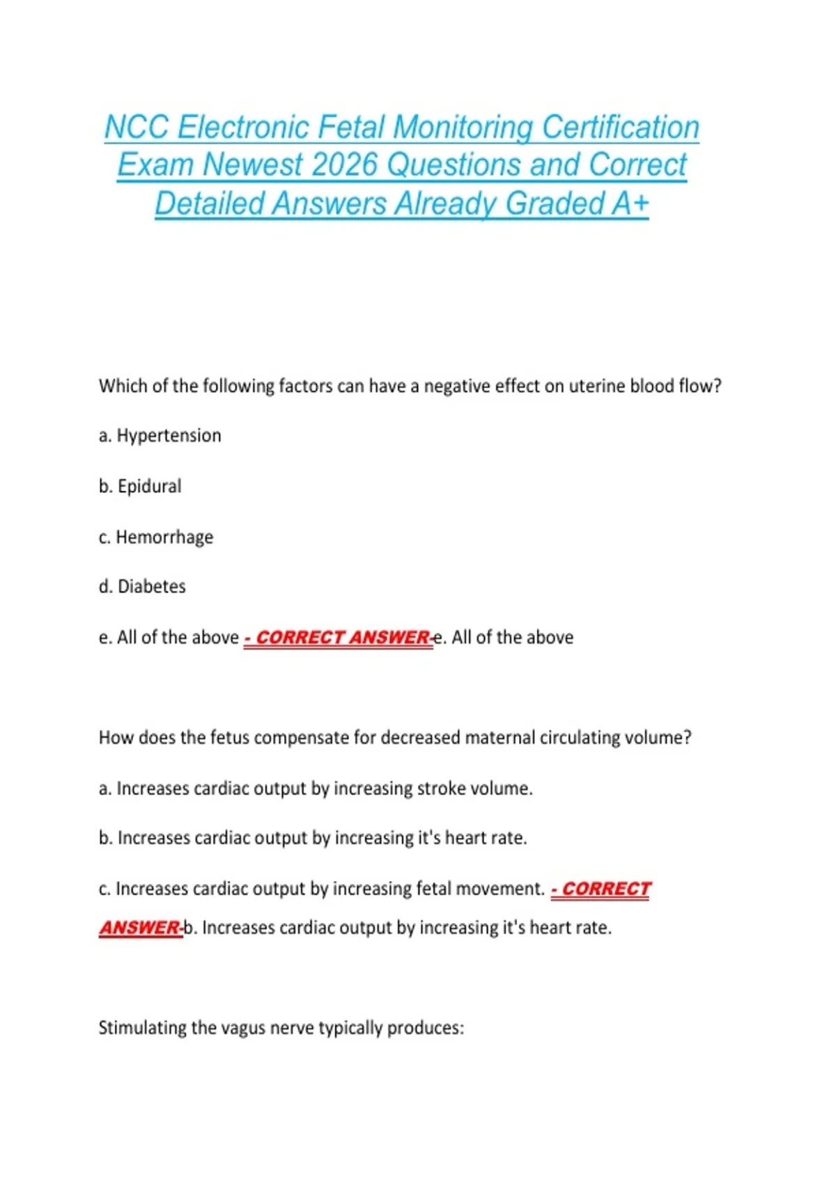 NCC Electronic Fetal Monitoring Certification Exam Newest 2026 Questions and Correct Detailed Answers Already Graded A+