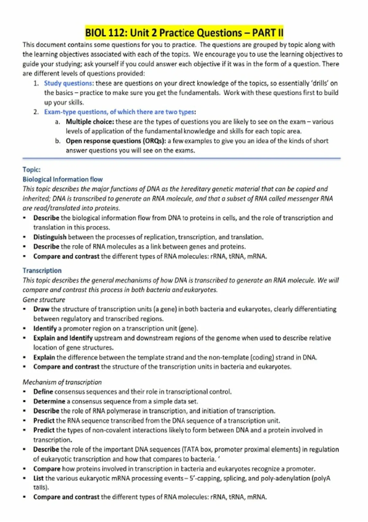 Master Part II of UBC BIOL 112 Unit 2 with this comprehensive practice set. This guide focuses on the high-yield mechanics of Biological Information Flow. It includes detailed answer keys for Open Response Questions (ORQs) and comparison tables that are essential for midterm and final exam success.