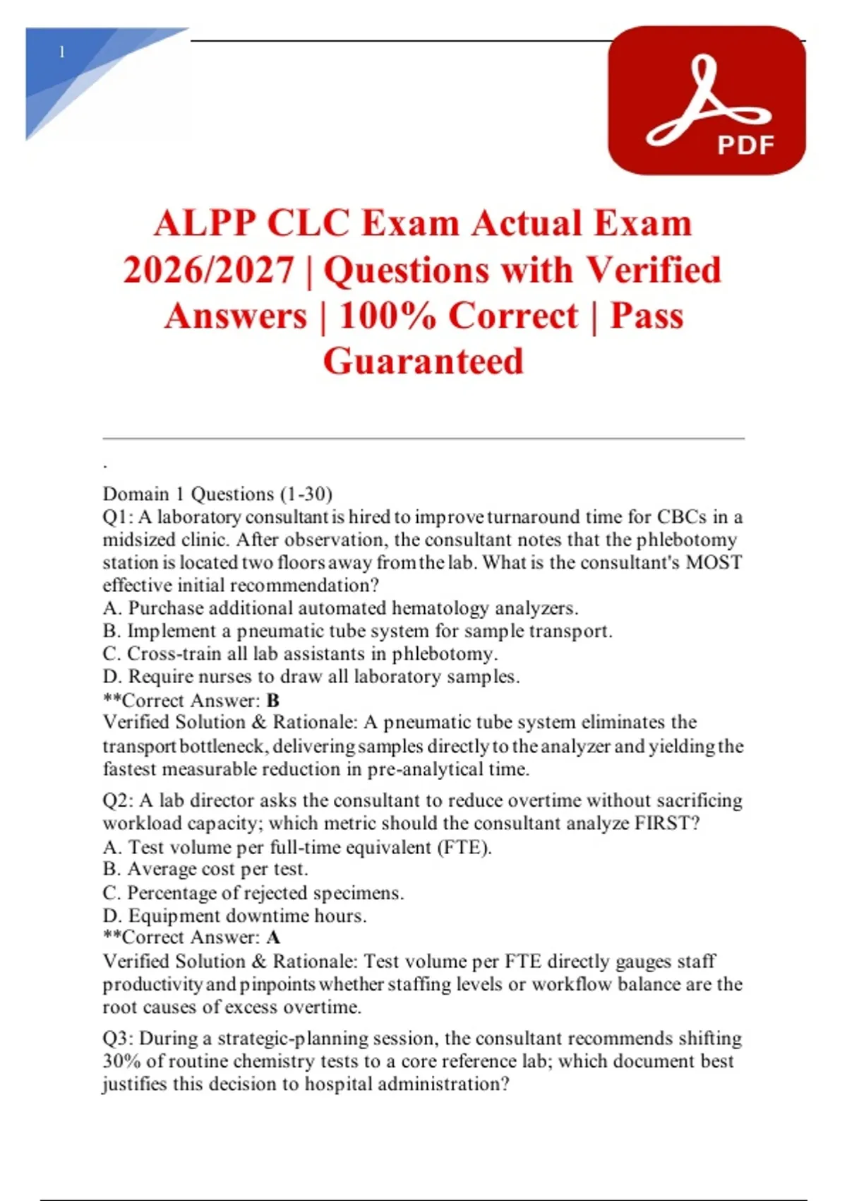 ALPP CLC EXAM ACTUAL EXAM 2026/2027 | PASS GUARANTEED Prepare with the actual ALPP CLC Exam - Pass Guaranteed! This resource contains actual exam questions and verified answers for the 2026/2027 American Society for Clinical Pathology Certified Laboratory Consultant Examination. Guaranteed to help you pass or your money back. WHAT'S INCLUDED: • Actual CLC Exam Questions from ALPP Certification • 100% Verified Answers with laboratory rationales • Complete Exam Content tested on the actual assessment • Laboratory Consultant Standards from the real test • Professional PDF – Instant digital download • PASS GUARANTEED – Confidence in your success KEY FEATURES: • Actual Exam Content – Real ALPP CLC questions • Pass Guarantee – Your success assured • Certification Readiness – Laboratory standards preparation • Newest Version – Most current CLC content • Updated for 2026/2027 – Current ALPP standards ACTUAL EXAM TOPICS: Laboratory Management – Actual exam questions Consultant Principles – Real test scenarios Clinical Laboratory Standards – CLC content Quality Assurance – Practice questions DETAILS: Exam: ALPP CLC Exam Certification: Certified Laboratory Consultant Year: 2026/2027 Format: PDF (Printable, Searchable) Delivery: Instant Download Guarantee: Pass Guaranteed