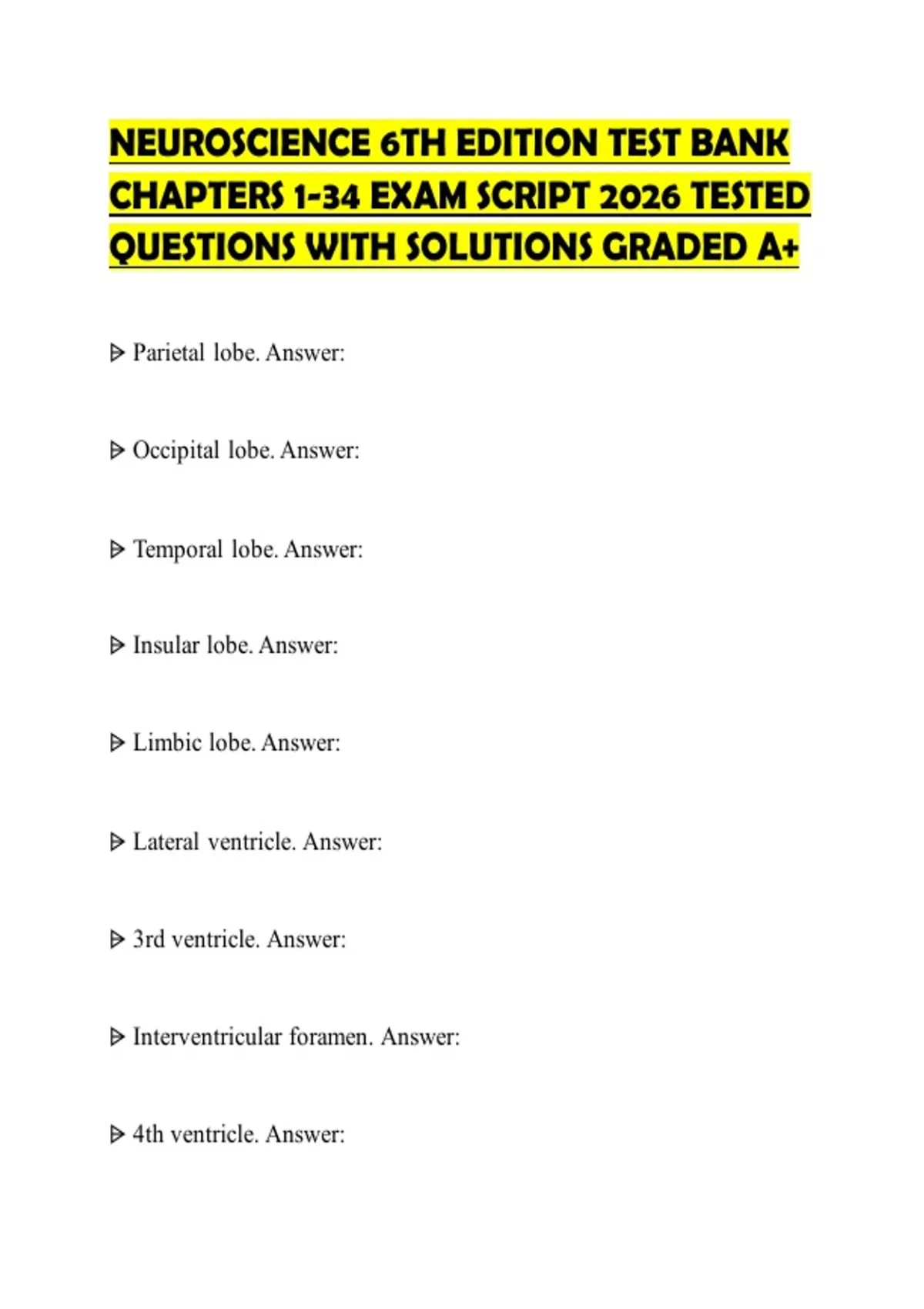 NEUROSCIENCE 6TH EDITION TEST BANK CHAPTERS 1-34 EXAM SCRIPT 2026 TESTED QUESTIONS WITH SOLUTIONS GRADED A