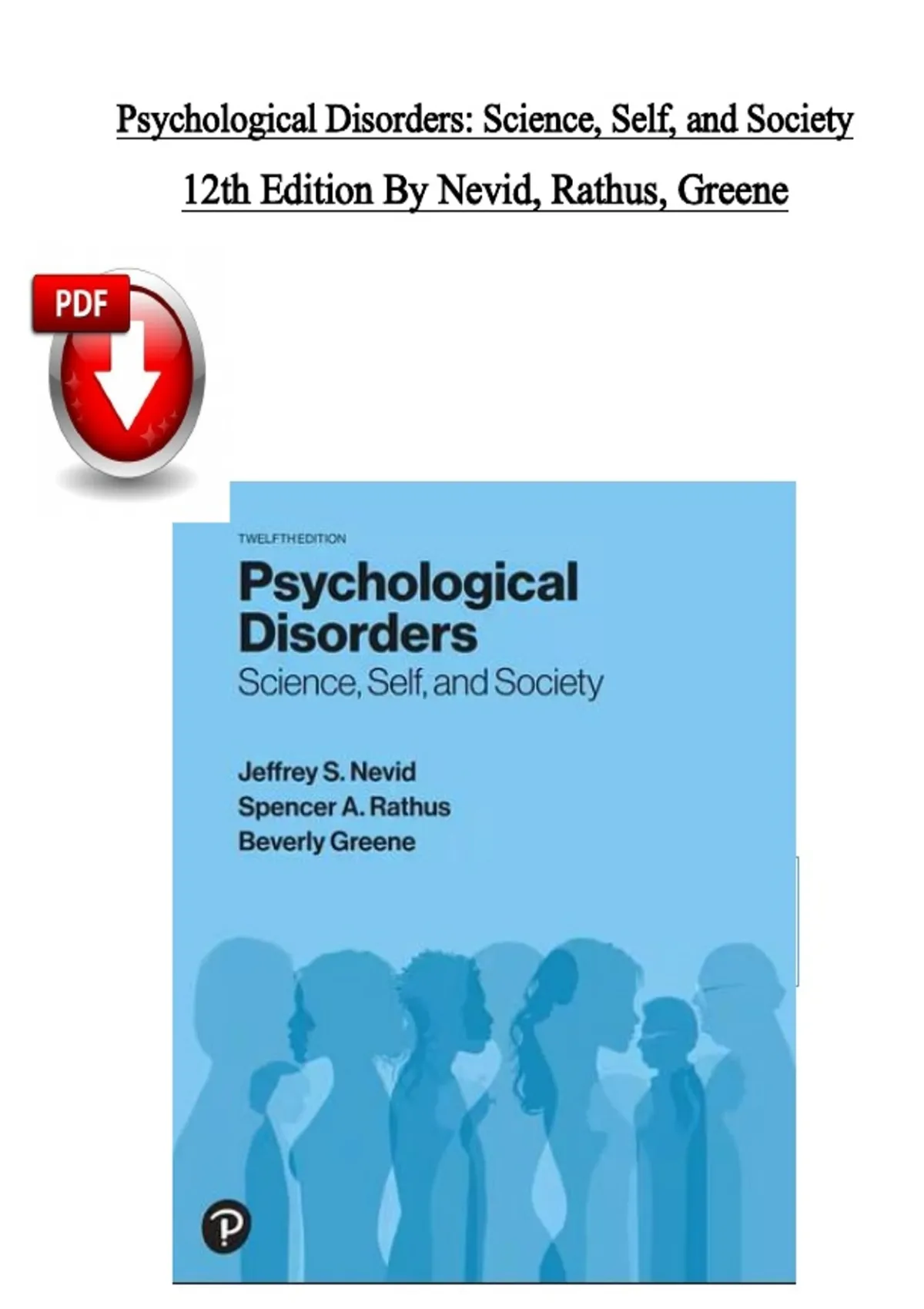Test Bank – Psychological Disorders: Science, Self, and Society, 12th Edition | Nevid, Rathus & Greene | All Chapters Covered | Latest Edition Master your abnormal psychology and psychological disorders coursework with this complete test bank PDF for Psychological Disorders: Science, Self, and Society, 12th Edition by Jeffrey S. Nevid, Spencer A. Rathus & Beverly S. Greene. Grounded in a biopsychosocial framework, the textbook covers core topics such as research methods, classification/assessment, major disorder categories, and contemporary treatment perspectives — all of which are reflected in this chapter‑by‑chapter test bank. Introduction & Research Methods in Abnormal Psychology Perspectives on Abnormal Behavior & Treatment Approaches Assessment & Classification of Disorders Stress‑Related Disorders Anxiety, OCD & Related Disorders Dissociative, Somatic & Health‑Related Disorders Mood Disorders & Suicide Substance‑Related & Addictive Disorders Eating & Sleep‑Wake Disorders Gender/Sexuality‑Related Disorders Schizophrenia Spectrum Disorders Personality & Impulse‑Control Disorders Child/Adolescent Disorders Neurocognitive & Aging‑Related Disorders Legal & Ethical Issues in Psychological Disorders Psychological Disorders test bank PDF, Nevid Rathus Greene 12th Edition, abnormal psychology practice questions with answers, psychopathology exam prep, anxiety & mood disorders review, substance use disorders study guide, schizophrenia & personality disorders Q&A, developmental disorders test bank, instant download psychology test bank