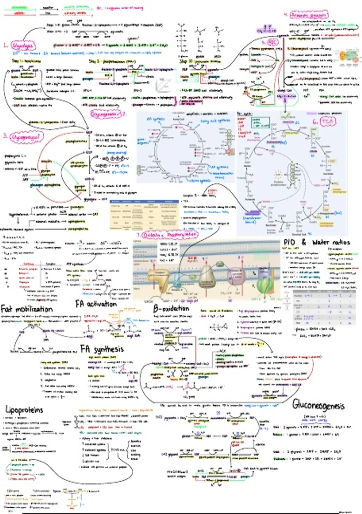 Page 1 covers Glycolysis, Glycogenesis, Glycogenolysis, Anaerobic Glycolysis, Citric Acid Cycle, Oxidative Phosphorylation, Fat Mobilization, Fatty Acid Activation, Beta Oxidation, Fatty Acid Synthesis, Lipoproteins and Gluconeogenesis. Page 2 covers Membrane Structure, Lipids, Membrane Proteins, Transport, Signalling, Metabolism and Carbohydrates