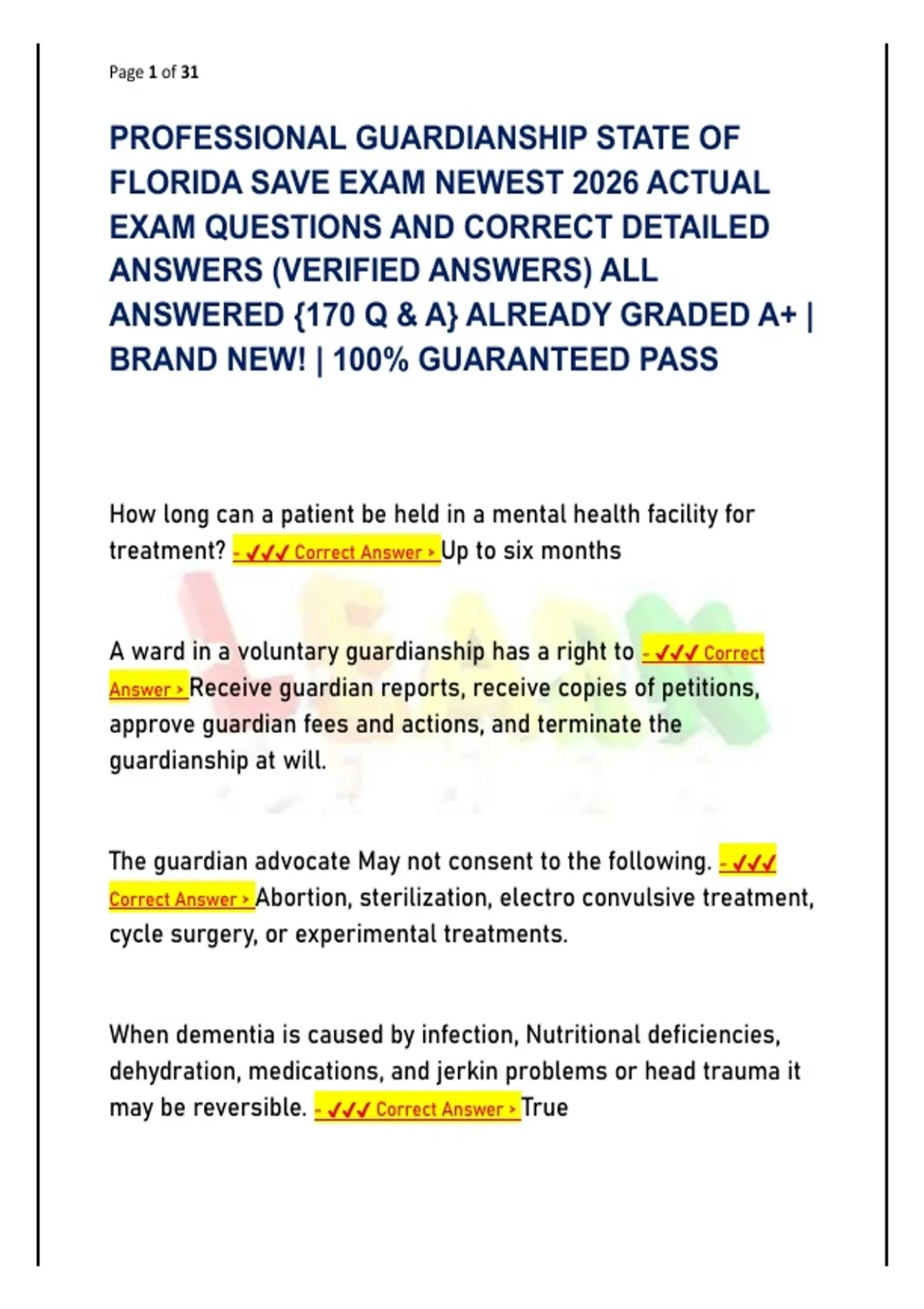 Comprehensive test bank for the Professional Guardianship State of Florida Exam 2026. Includes verified questions and answers covering guardianship laws, responsibilities, ethical standards, legal procedures, and exam-focused content for certification preparation.