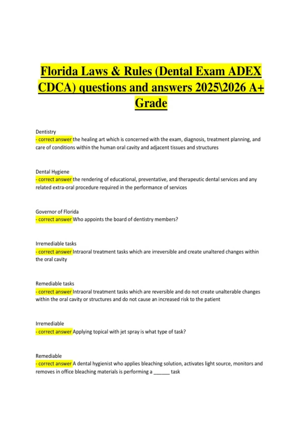 Florida Laws & Rules – Dental Exam ADEX CDCA | Verified Questions & Correct Detailed Answers | 2025/2026 A+ Grade