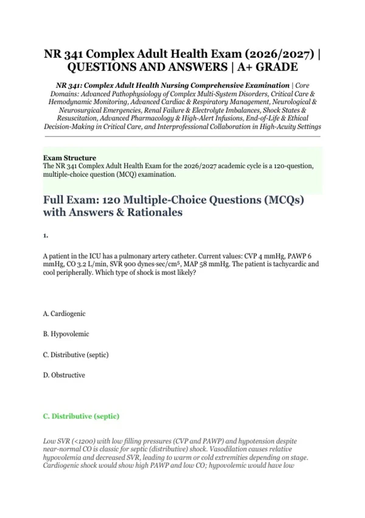 This document contains the NR 341 Complex Adult Health Nursing comprehensive examination with exam-style questions and correct answers designed for high-level nursing assessment. It covers advanced pathophysiology of complex multisystem disorders, critical care and hemodynamic monitoring, advanced cardiac and respiratory management, neurological and neurosurgical emergencies, renal failure and electrolyte imbalances, shock and resuscitation, high-alert pharmacology, end-of-life and ethical decision-making, and interprofessional collaboration in high-acuity settings. The content is structured to support advanced clinical judgment and A+ performance for the 2026/2027 academic year.