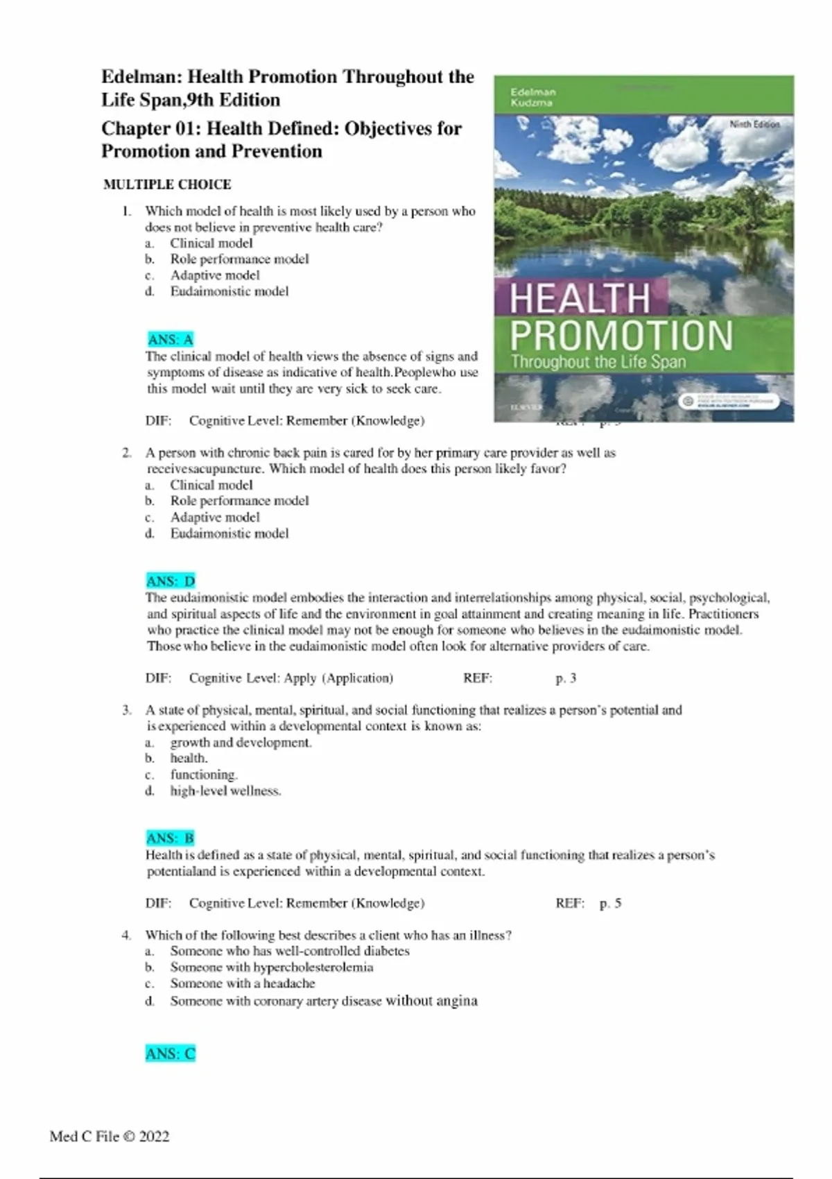 Test Bank For Health Promotion Throughout the Life Span 9th Edition By Carole Edelman. All Chapters Including: Unit 1: Foundations for Health Promotion 1. Health Defined: Objectives for Promotion and Prevention 2. Emerging Populations and Health 3. Health Policy and the Delivery System 4. The Therapeutic Relationship 5. Ethical Issues Related to Health Promotion Unit 2: Assessment for Health Promotion 6. Health Promotion and the Individual 7. Health Promotion and the Family 8. Health Promotion and the Community Unit 3: Interventions for Health Promotion 9. Screening 10. Health Education 11. Nutrition Counseling for Health Promotion 12. Exercise 13. Stress Management 14. Complementary and Alternative Strategies Unit 4: Application of Health Promotion 15. Overview of Growth and Development Framework 16. The Prenatal Period 17. Infant 18. Toddler 19. Preschool Child 20. School-Age Child 21. Adolescent 22. Young Adult 23. Middle-Age Adult 24. Older Adult Unit 5: Emerging Global Health Issues 25. Health Promotion for the Twenty-First Century: Throughout the Life Span and Throughout the World