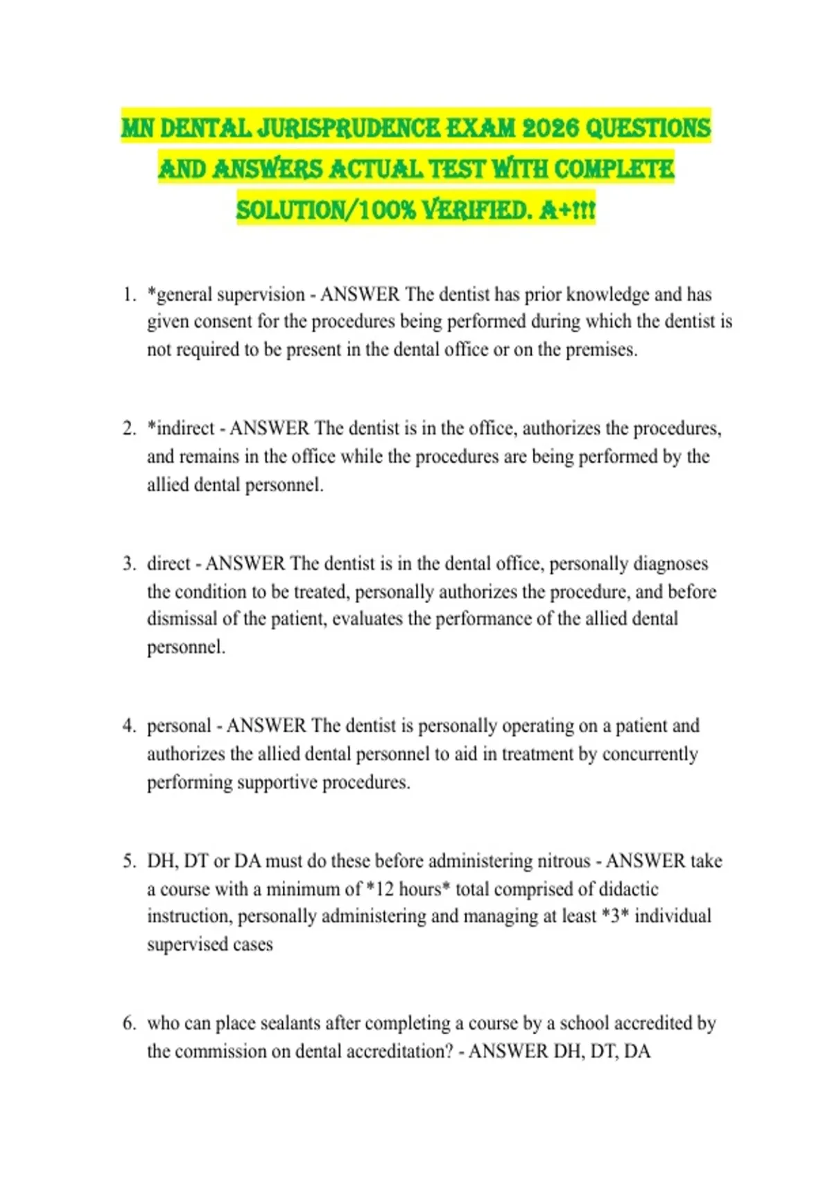 MN Dental Jurisprudence Exam 2026 Questions and Answers Actual Test with complete solution/100% Verified. A+!!! 1. *general supervision - ANSWER The dentist has prior knowledge and has given consent for the procedures being performed during which the dentist is not required to be present in the dental office or on the premises. 2. *indirect - ANSWER The dentist is in the office, authorizes the procedures, and remains in the office while the procedures are being performed by the allied dental personnel. 3. direct - ANSWER The dentist is in the dental office, personally diagnoses the condition to be treated, personally authorizes the procedure, and before dismissal of the patient, evaluates the performance of the allied dental personnel. 4. personal - ANSWER The dentist is personally operating on a patient and authorizes the allied dental personnel to aid in treatment by concurrently performing supportive procedures. 5. DH, DT or DA must do these before administering nitrous - ANSWER take a course with a minimum of *12 hours* total comprised of didactic instruction, personally administering and managing at least *3* individual supervised cases 6. who can place sealants after completing a course by a school accredited by the commission on dental accreditation? - ANSWER DH, DT, DA 7. *WHO can give local anesthesia after completing a course on local anesthesia from a school accredited by the Commission on Dental Accreditation - ANSWER DH and DT (not DA) 8. *Dental hygienists and licensed dental assistants shall not take impressions and bite registrations for _____________ of fixed and removable prostheses. - ANSWER Final construction 9. *Before removal of bond material, a dental hygienist or licensed dental assistant must successfully complete a course in the use of ____________ for the express purpose of the removal of bond material from teeth. - ANSWER rotary instruments 10. T/F a complete medical & dental history does NOT need to be completed for emergency treatment - ANSWER false; if its a regular patient, can just update their history but new patients/infrequent patients must complete both 11. T/F DHCP only has to sign their initials in patient notes when they're in a group practice - ANSWER false; patient notes must ALWAYS be signed by a DHCP 12. The board may obtain medical data & health records of a licensee or applicant w/o consent if the information is requested by the board as part of a - ANSWER Physical or chemical dependency assessment 13. Removable dental prostheses owner identification - ANSWER Every complete upper & lower denture & removable prosthesis fabricated by a dentist or by a dentists or DT work order must be marked w/the patients social security number (must be permanent, legible, & cosmetically acceptable) 14. Which of the following statements is NOT true regarding professional development? - ANSWER A self-assessment test must be sent to the board to verify completion 15. Which of the following orthodontic function is performed by the LDA and hygienist under direct supervision? - ANSWER Remove fixed ortho bands and brackets 16. A limited registration dental assistant may perform which of the following expanded functions? - ANSWER Take Radiographs 17. Which of the following is true if a correction needs to be done in a patient record? - ANSWER Place a single line through the mistake 18. Which of the following functions can be performed by a dental hygienist when the dentist is out of the office? A. Administer local anesthesia B. Monitor a patient induced into nitrous oxide relative analgesia C. Take radiographs D. All of the above - ANSWER D. All of the above 19. A dental technician can fabricate a partial denture for a patient if the technician has received which of the following? A. A written request from the dentist B. A verbal request from the dentist C. C. A request from the patient D. D. All of the above - ANSWER A. A written request from the dentist Which of the following is/are true regarding waste disposal? A. Disposable needles placed intact in puncture proof containers B. Disposed of according to state and local guidelines C. Contaminated solid waste should be placed in sturdy impervious bags D. All of the above - ANSWER All of the above A dentist may administer nitrous oxide relative analgesia in Minnesota if the dentist __________________. A. has been licensed in Texas and completed the requirements of that state B. has completed a 12 hour course accredited by the Commission on Dental Accreditation C. has an auxiliary assisting that is CPR certified D. had previously registered with the board prior to January 1, 1993 E. B and D - ANSWER E. B and D Which of the following are considered minimum number of hours for professional development for a biennial cycle? A. Dentist - 50 B. Hygienist - 30 C. Licensed Dental Assistant - 25 D. A and C E. A, B, and C - ANSWER D. A and C Which of the following is true if a correction needs to be done in a patient record? A. erase the mistake B. use white out to remove the mistake C. write in pencil D. place a single line through the mistake - ANSWER D. place a single line through the mistake If you have a change of address, how much time do you have to notify the board?a. 7 daysb. 14 daysc. 30 daysd. 90 days - ANSWER 30 days A person with knowledge that a dental professional has HIV, HBV or HCV shall do what? a. Keep it to themselves b. File a report with the commissioner of health c. Write a letter to the dental professional d. Discuss this information with their medical doctor - ANSWER File a report with the commissioner of health Which of the following would NOT be a reason that the Board of Dentistry could suspend your license? a. To ensure that the licensee does not violate statutes again b. To ensure the licensee does not benefit from the violation financially c. The Board of Dentistry must generate a certain amount of revenue each year d. All of the above are reasons to suspend a license - ANSWER The Board of Dentis