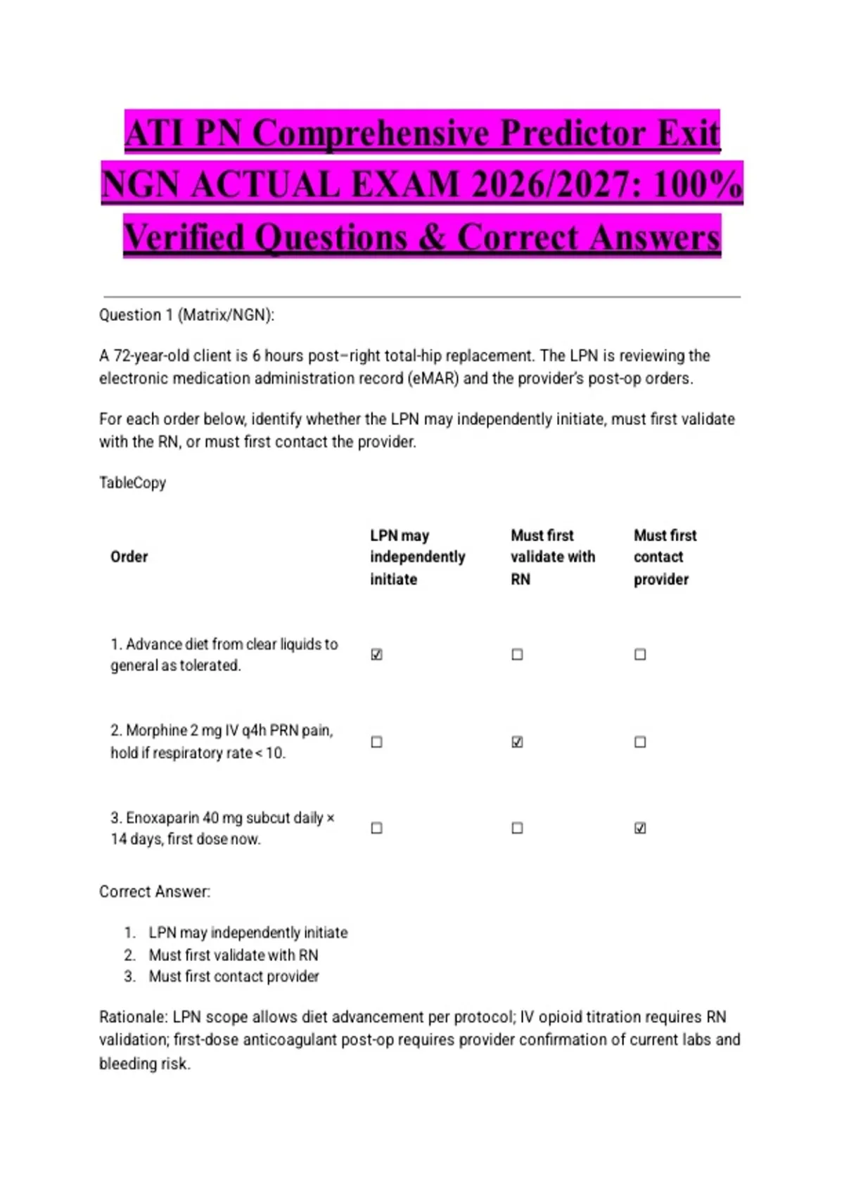 Ace your ATI PN Comprehensive Predictor Exit Exam (NGN) with this definitive 2026/2027 guide. It features the actual NGN-style exam with 100% verified questions and correct answers, covering all NCLEX-PN client needs categories and clinical judgment. Your key to predicting readiness, passing the predictor, and succeeding on the actual NCLEX-PN.