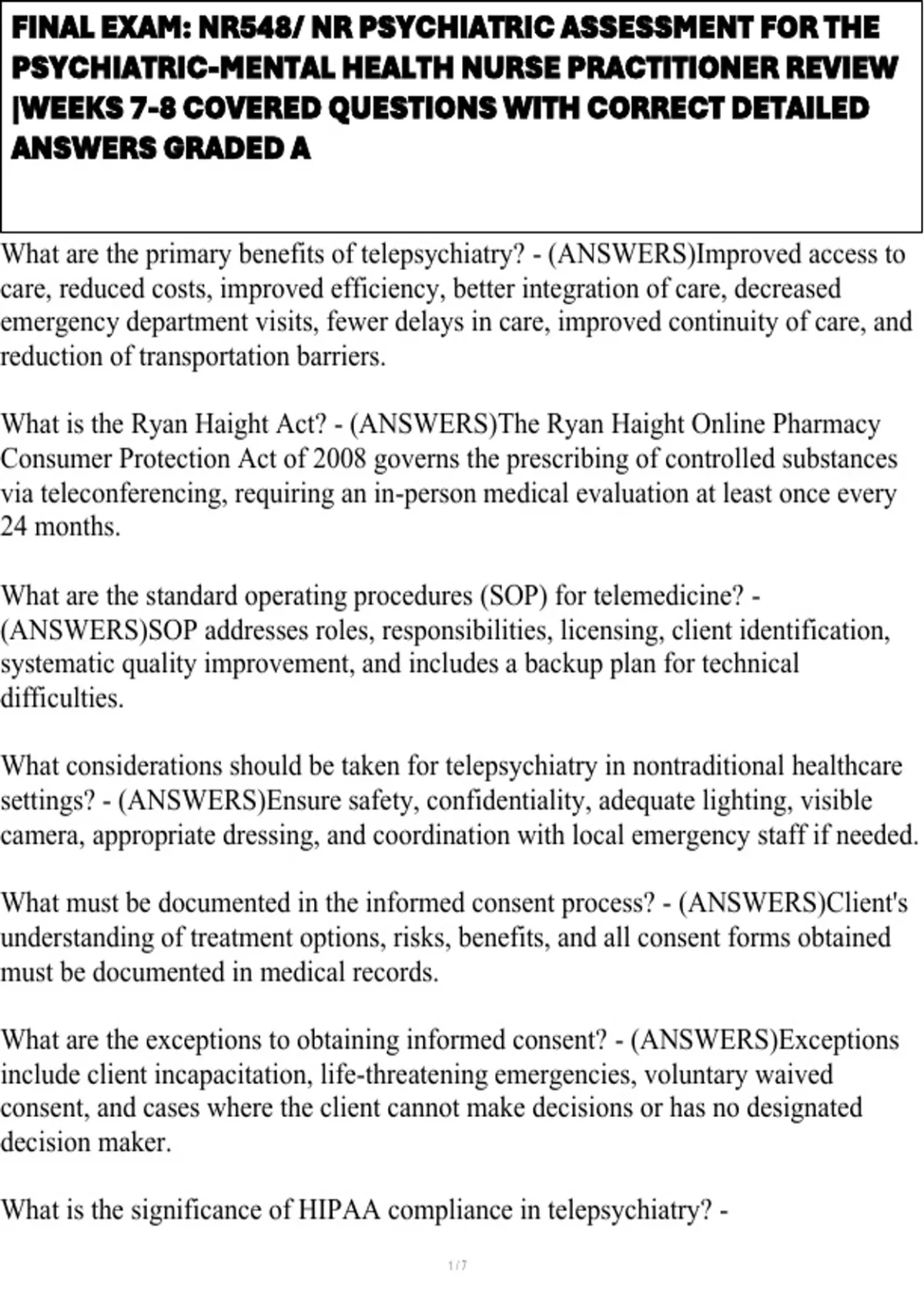 , FINAL EXAM: NR548/ NR PSYCHIATRIC ASSESSMENT FOR THE