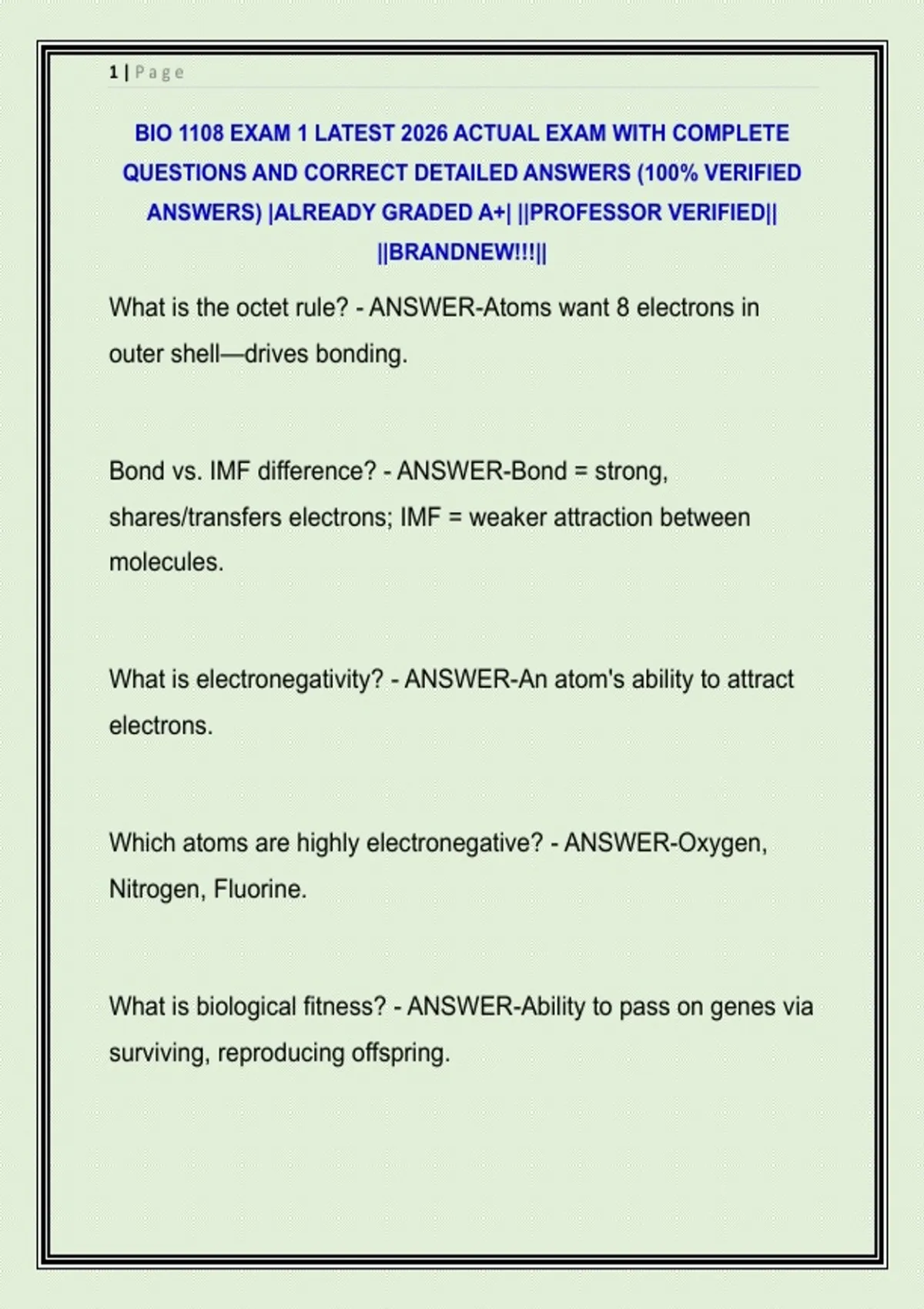 BIO 1108 EXAM 1 LATEST 2026 ACTUAL EXAM WITH COMPLETE QUESTIONS AND CORRECT DETAILED ANSWERS (100% VERIFIED ANSWERS) |ALREADY GRADED A+| ||PROFESSOR VERIFIED|| ||BRANDNEW!!!||