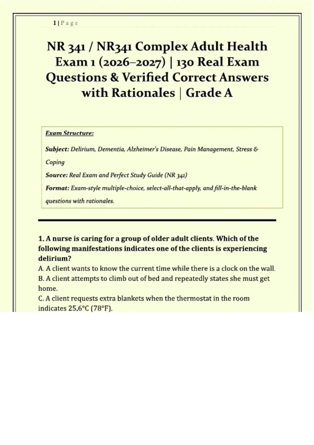 This NR 341 / NR341 Complex Adult Health Exam 1 (2026–2027) resource is a comprehensive, exam-aligned study guide featuring 130 real exam-style questions with verified correct answers and detailed rationales. It is designed for students enrolled in Complex Adult Health / Medical-Surgical Nursing courses. The content closely mirrors the latest 2026–2027 NR 341 Exam 1 format, question structure, and difficulty level, covering advanced adult health topics such as cardiovascular, respiratory, neurological, renal, endocrine, gastrointestinal disorders, fluid and electrolyte imbalances, pharmacologic management, prioritization, delegation, and clinical judgment application. All questions are 100% answered, accuracy-verified, and already graded A, making this a high-yield, exam-ready guide ideal for first-attempt success, strong exam performance, and confident clinical decision-making.