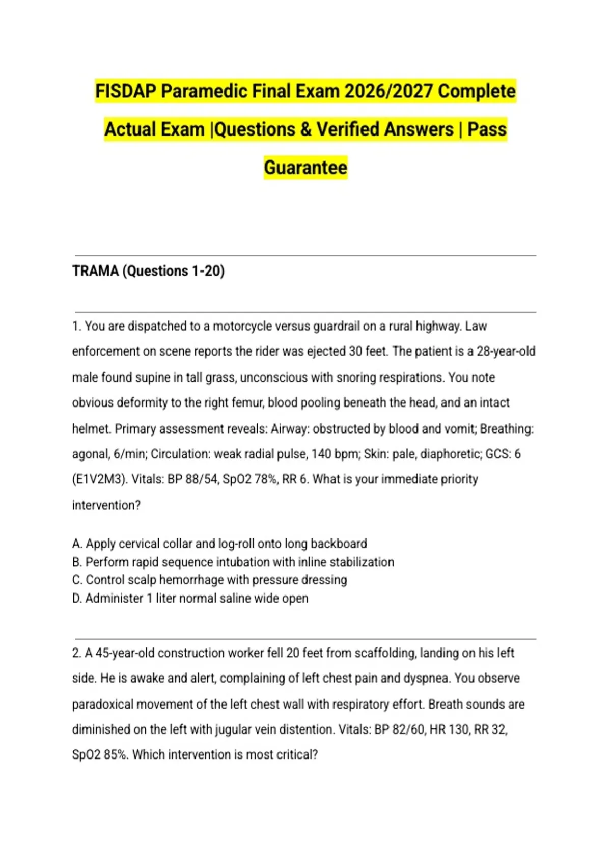 FISDAP Paramedic Final Exam 2026/2027 Complete