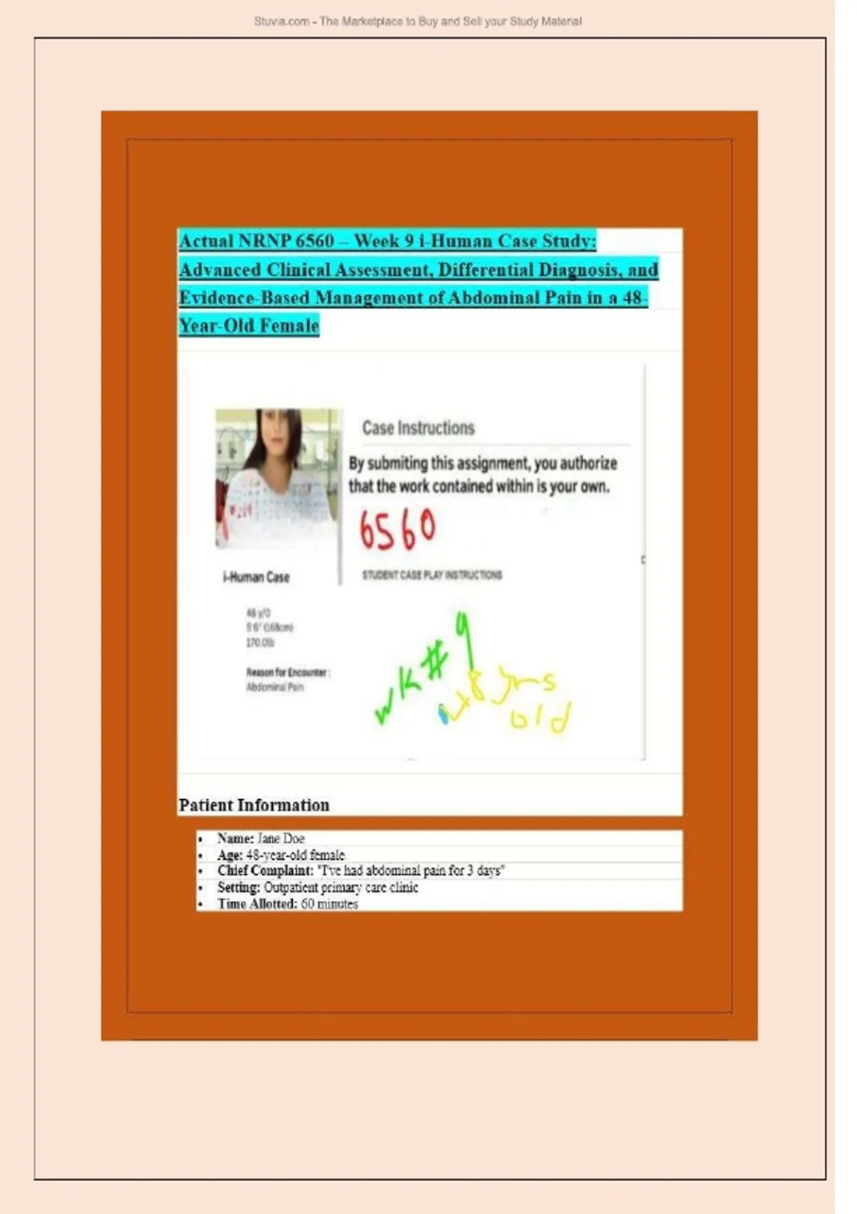 Struggling with clinical reasoning for abdominal pain cases? This comprehensive NRNP 6560 Week 9 i-Human Case Study guides you through an advanced clinical assessment of a 48-year-old female with LLQ pain. Inside, you’ll find detailed OLDCARTS history, differential diagnoses, diagnostic interpretation, and an evidence-based management plan—all structured to help you excel in simulations and real-world practice. Perfect for APRN students preparing for exams or clinical rotations, this case study sharpens your diagnostic skills, reinforces guideline-based care, and builds confidence in patient management. Get the tools you need to diagnose accurately, treat effectively, and succeed in your advanced practice role.