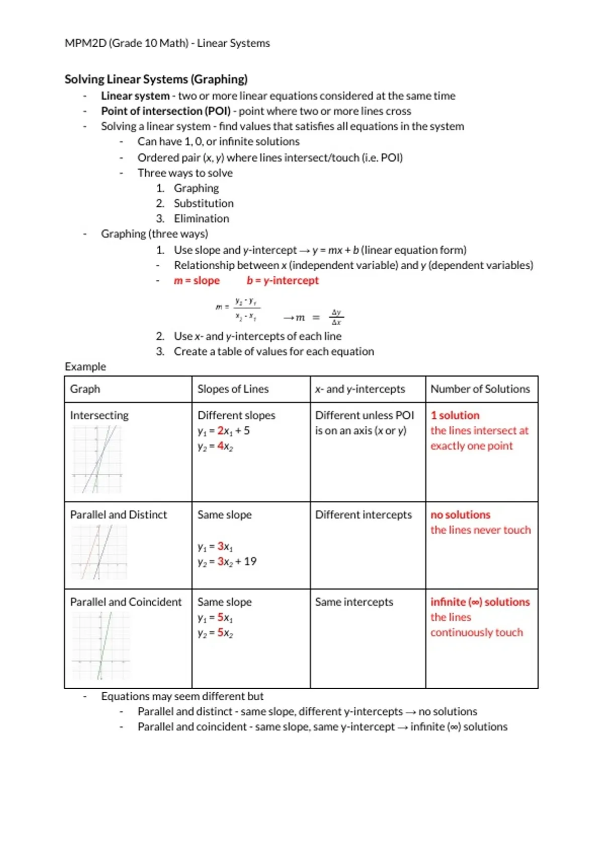 Summary MPM2D (Grade 10 Math) – Linear Systems Notes & Worked Examples (Ontario Curriculum)