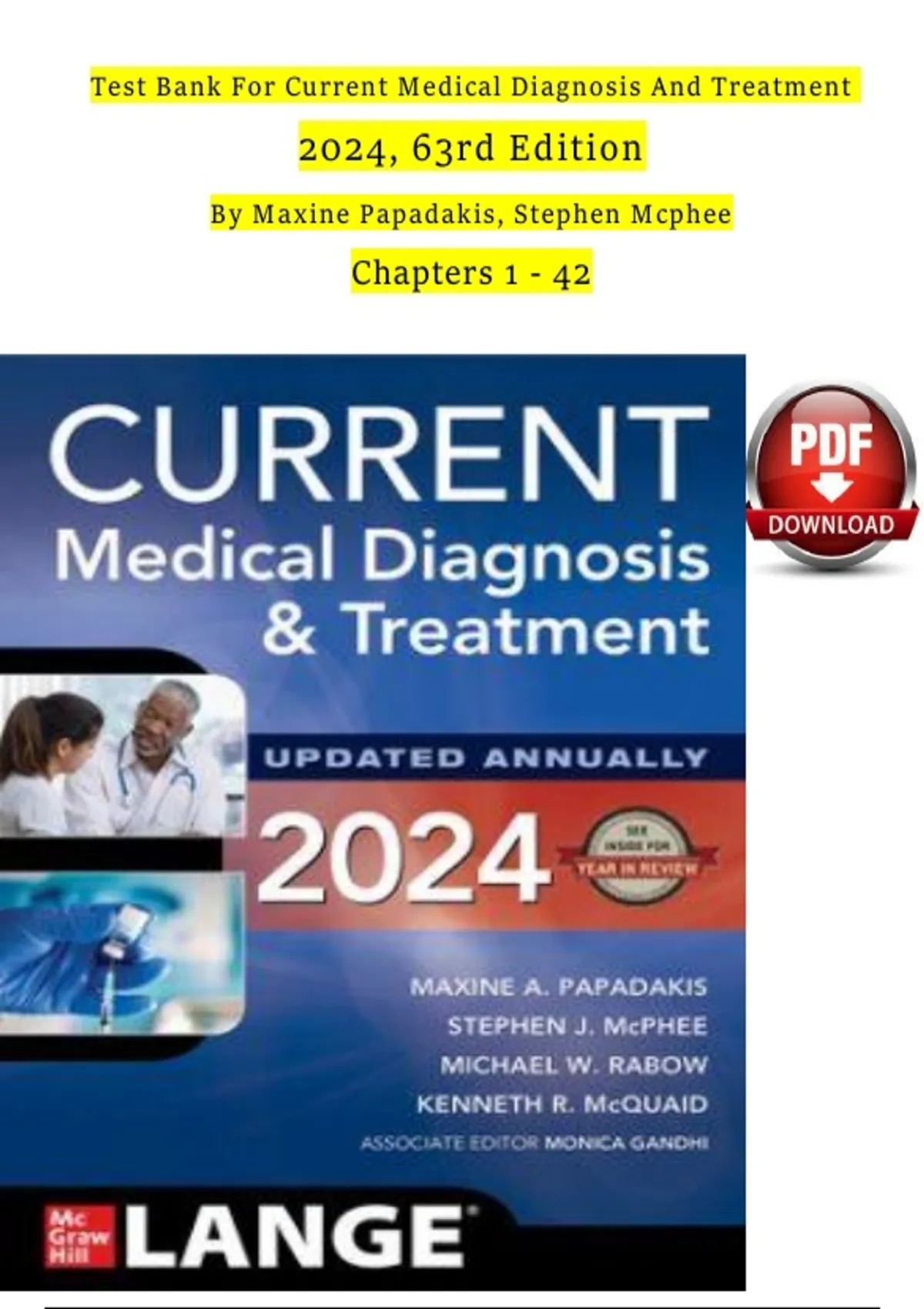 This document contains a comprehensive test bank covering Chapters 1–42 of Current Medical Diagnosis and Treatment (2024, 63rd Edition) by Maxine Papadakis and Stephen McPhee. It focuses on common medical conditions, diagnostic approaches, treatment strategies, and evidence-based patient care, making it a valuable resource for medical students, healthcare professionals, and exam preparation.