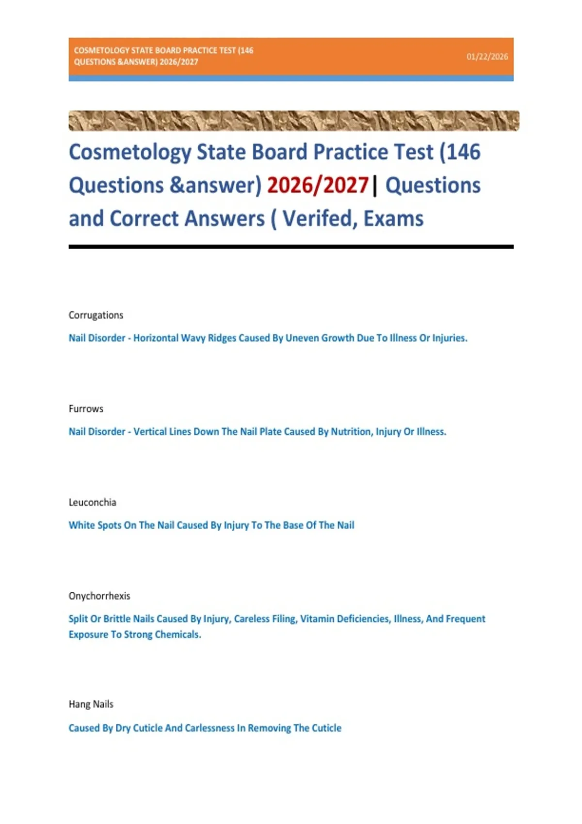 Cosmetology State Board Practice Test (146 Questions &answer) 2026/2027| Questions and Correct Answers ( Verifed, Exams