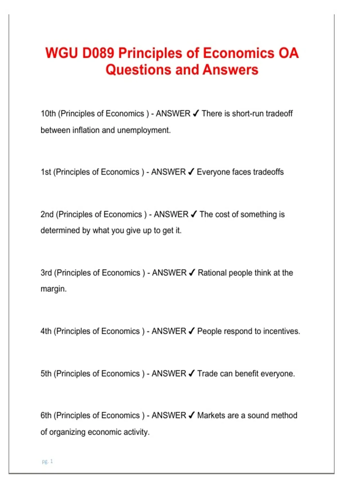 This 2026/2027 Test Bank for WGU D089 Principles of Economics provides comprehensive practice questions and answers covering microeconomics, macroeconomics, supply and demand, market structures, fiscal and monetary policy, and applied economic problem-solving. Designed for WGU students, this guide emphasizes critical thinking, practical application, and exam readiness, making it an essential resource for mastering core economic principles and excelling in both coursework and assessments.
