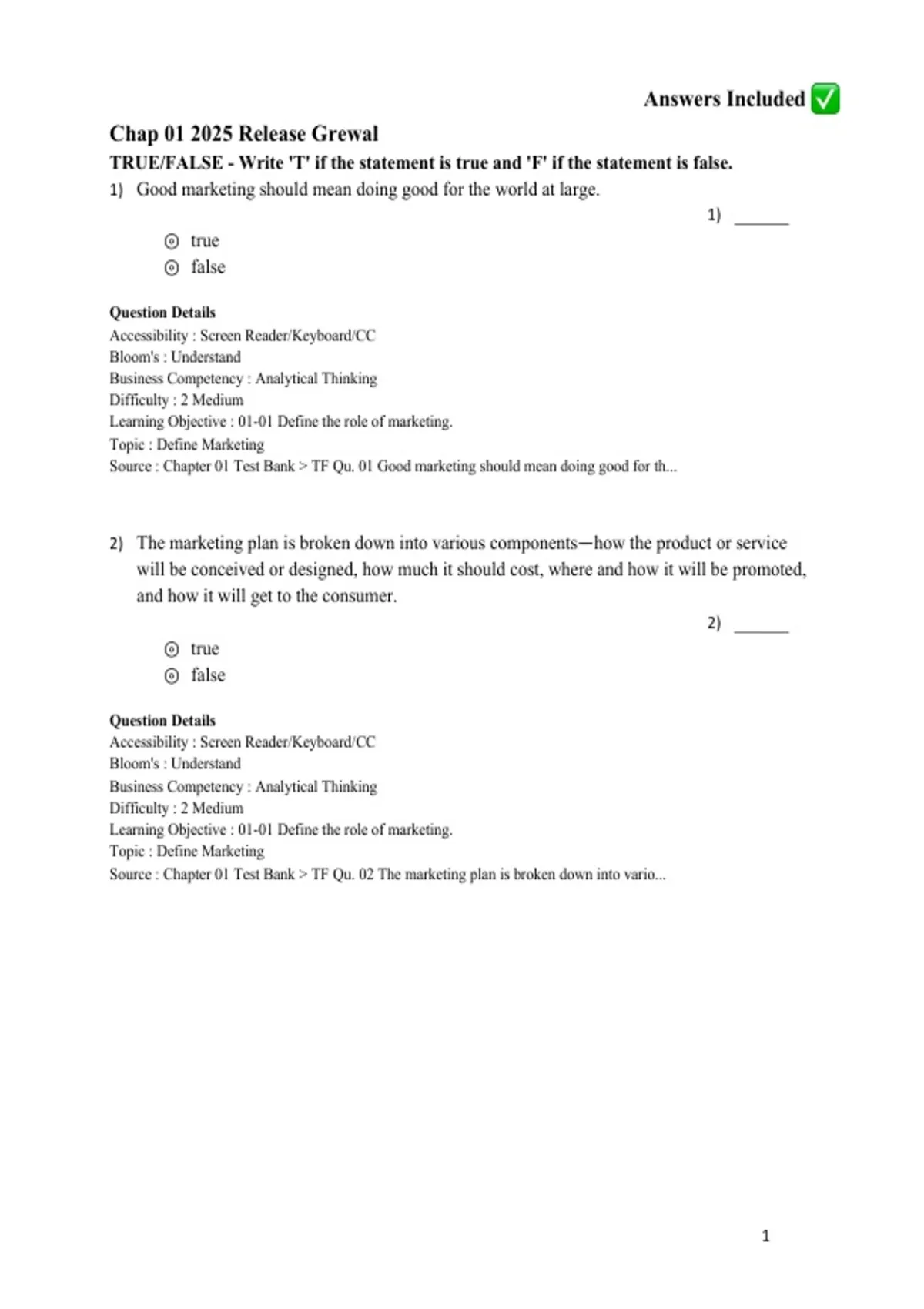 Source : Chapter 01 Test Bank > TF Qu. 02 The marketing plan is broken down into vario...