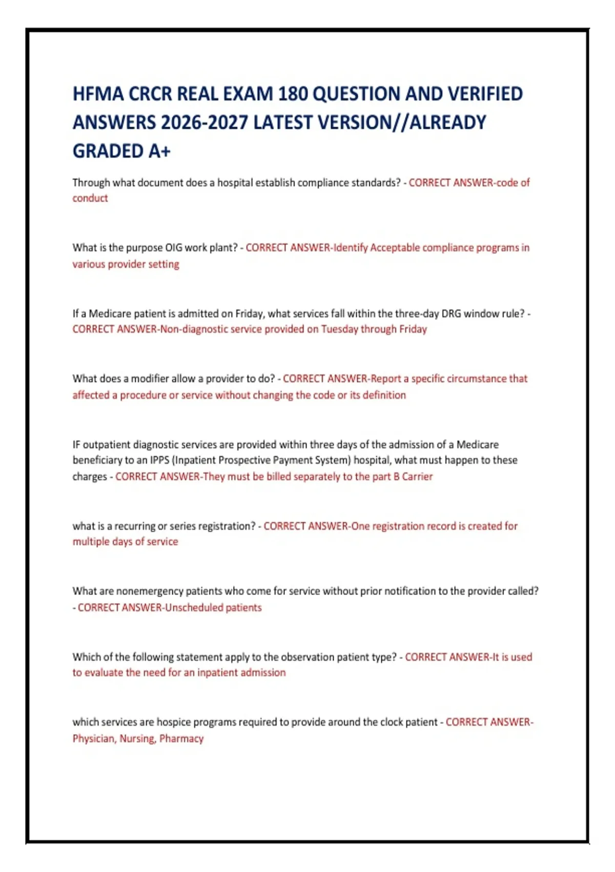 Pass with confidence using this HFMA CRCR Real Exam (2026–2027 Latest Version) featuring 180 actual exam-style questions with fully verified correct answers. Carefully aligned with current CRCR competency domains, this A+ graded exam bank is ideal for final review, self-assessment, and first-attempt success. Accurate, comprehensive, and built for serious CRCR candidates.
