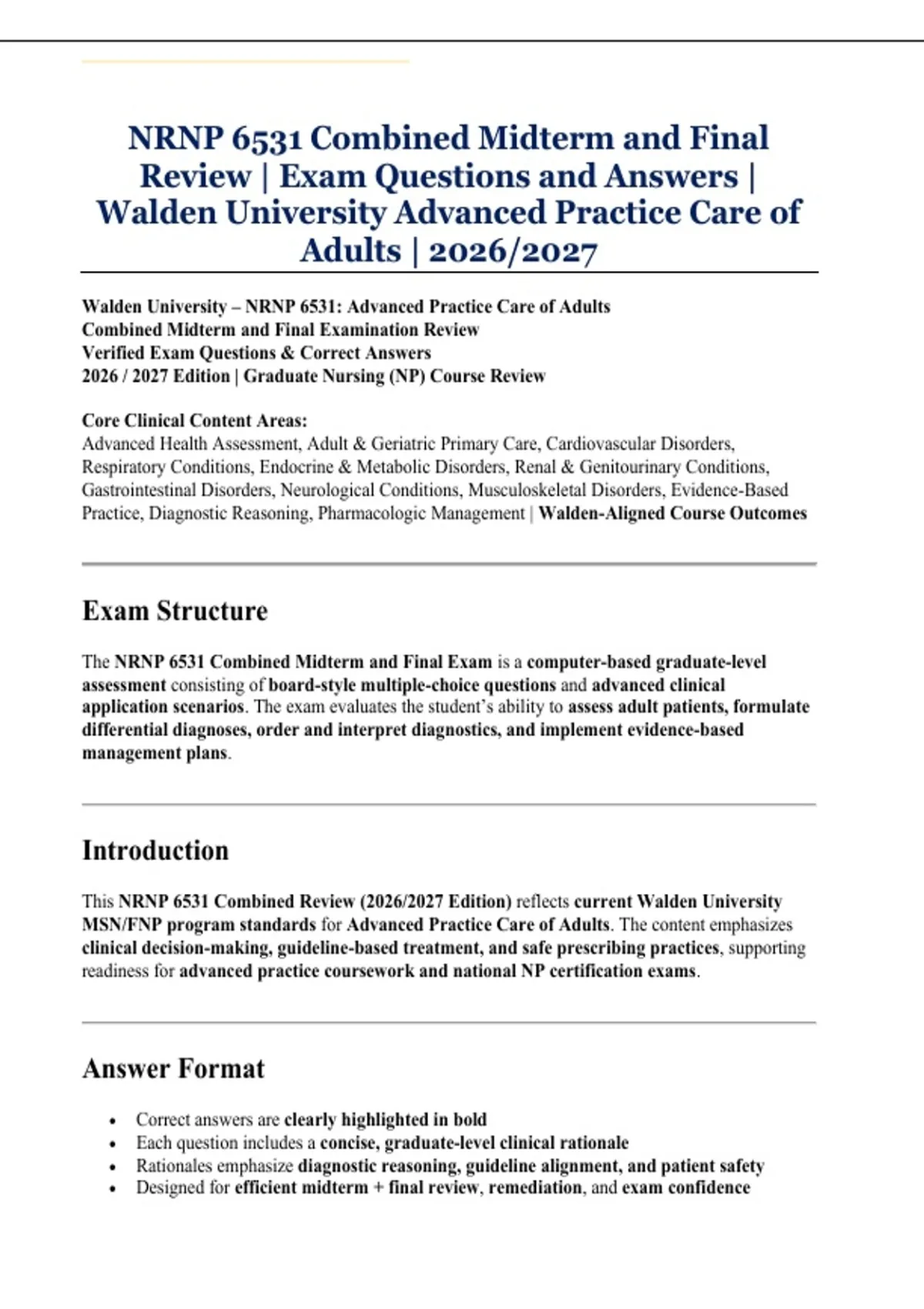 NRNP 6531 Combined Midterm and Final Review | Exam Questions and Answers | Walden University Advanced Practice Care of Adults | 2026/2027