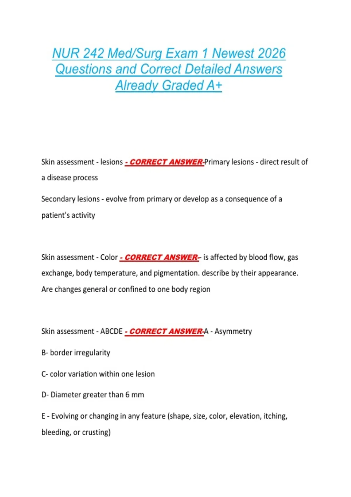 Skin assessment - lesions - CORRECT ANSWER-Primary lesions - direct result of