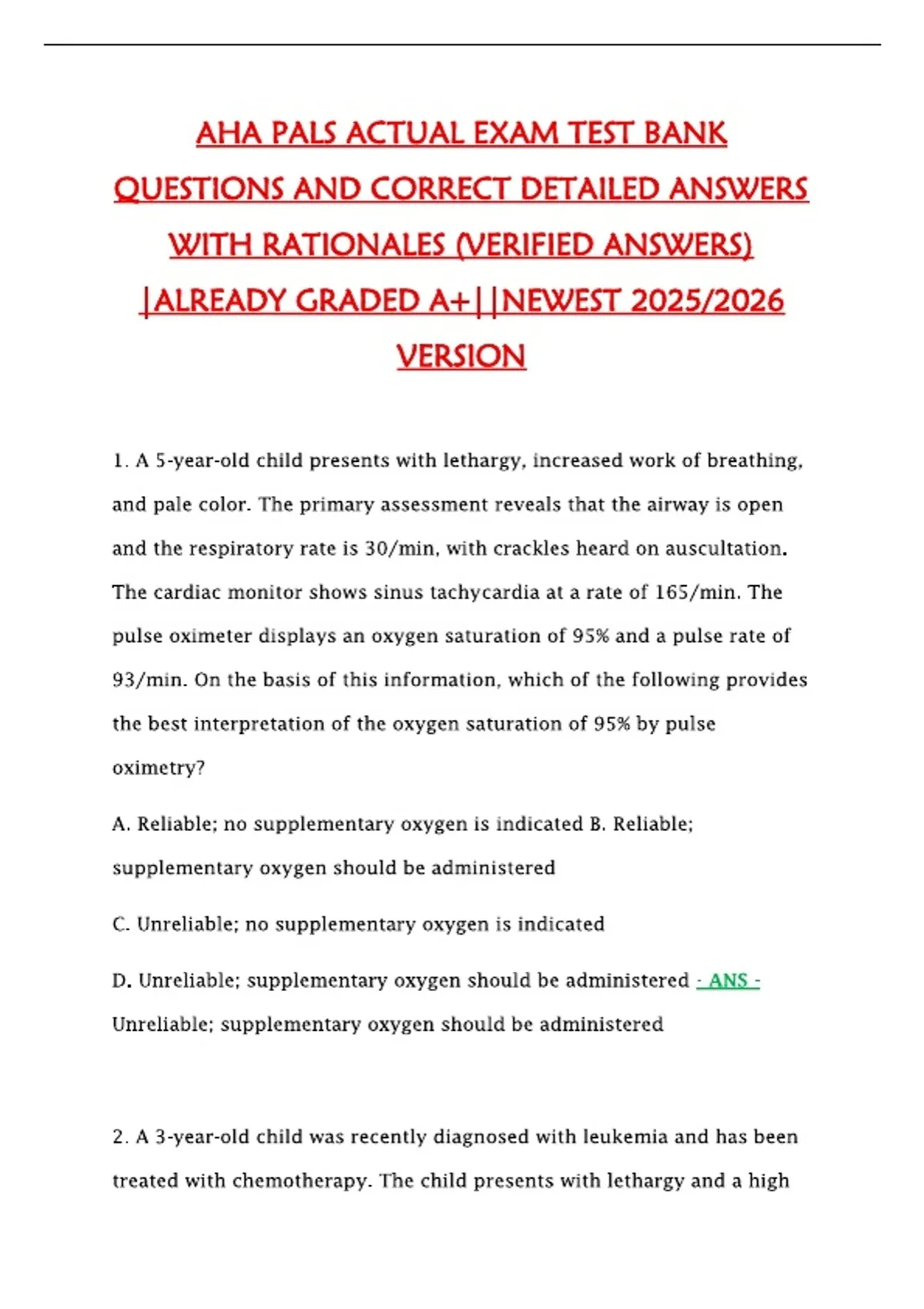 AHA PALS ACTUAL EXAM TEST BANK QUESTIONS AND CORRECT DETAILED ANSWERS WITH RATIONALES (VERIFIED ANSWERS) |ALREADY GRADED A+||NEWEST 2025/2026 VERSION