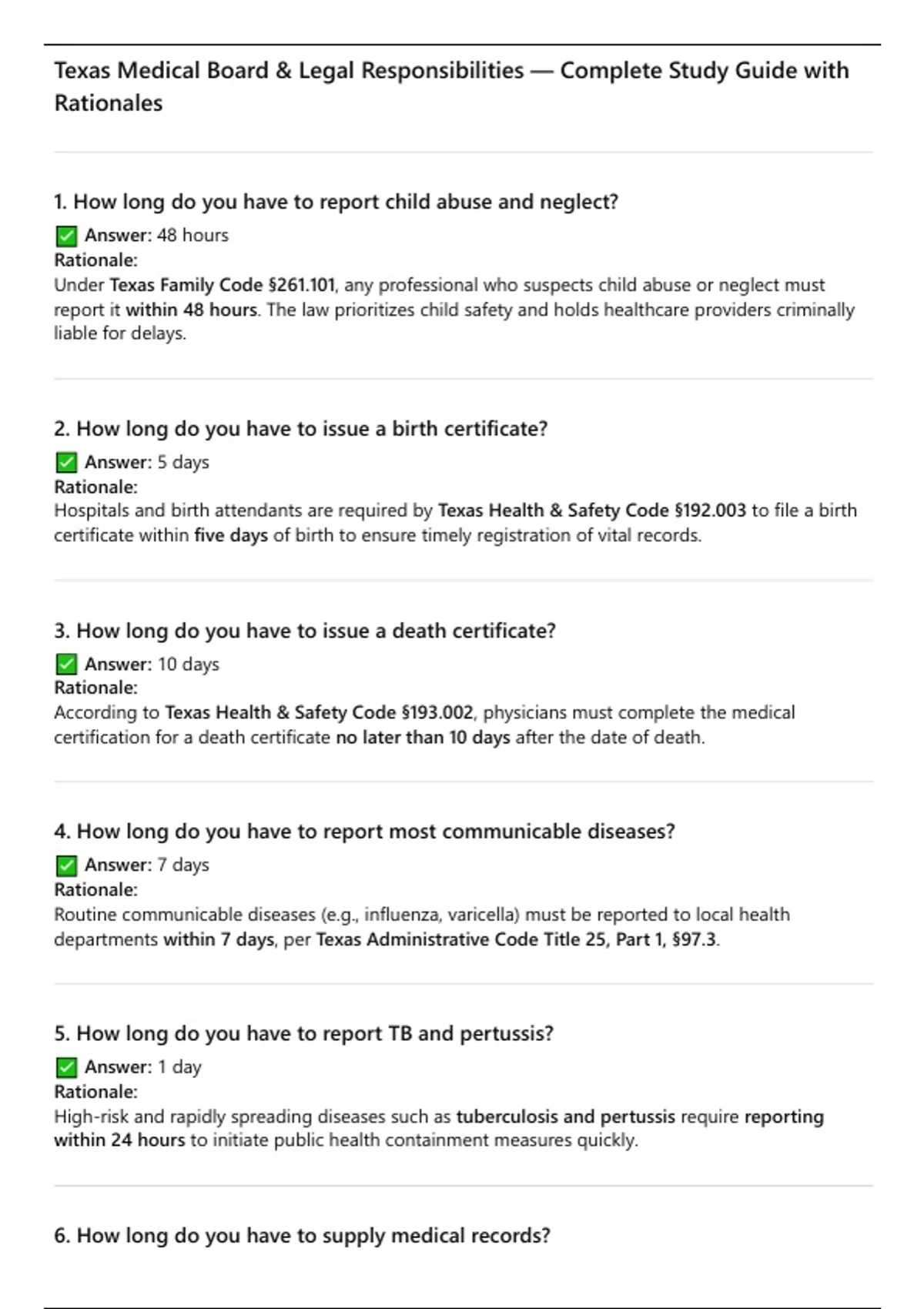 Texas Medical Board & Legal Responsibilities Complete Study Guide with Rationales 2025/ 2026