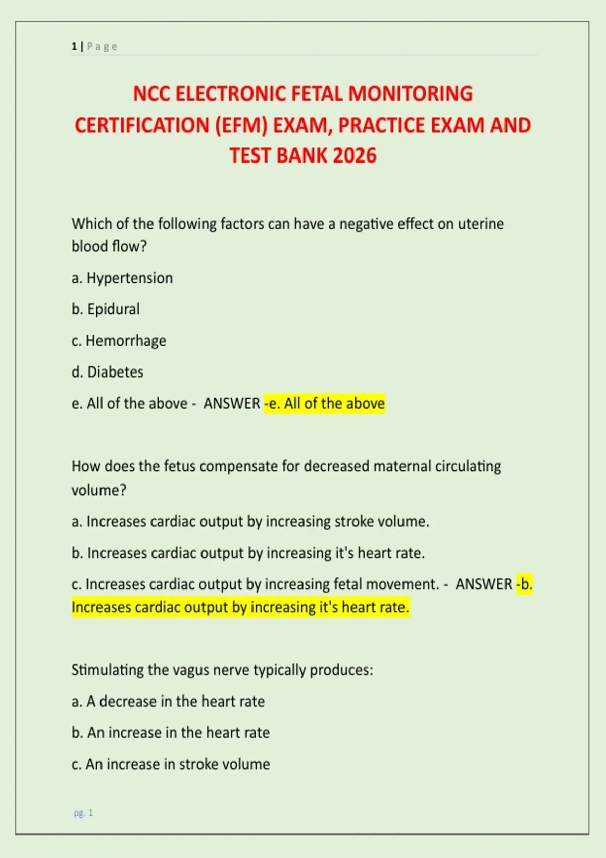 NCC ELECTRONIC FETAL MONITORING CERTIFICATION (EFM) EXAM, PRACTICE EXAM AND TEST BANK 2026