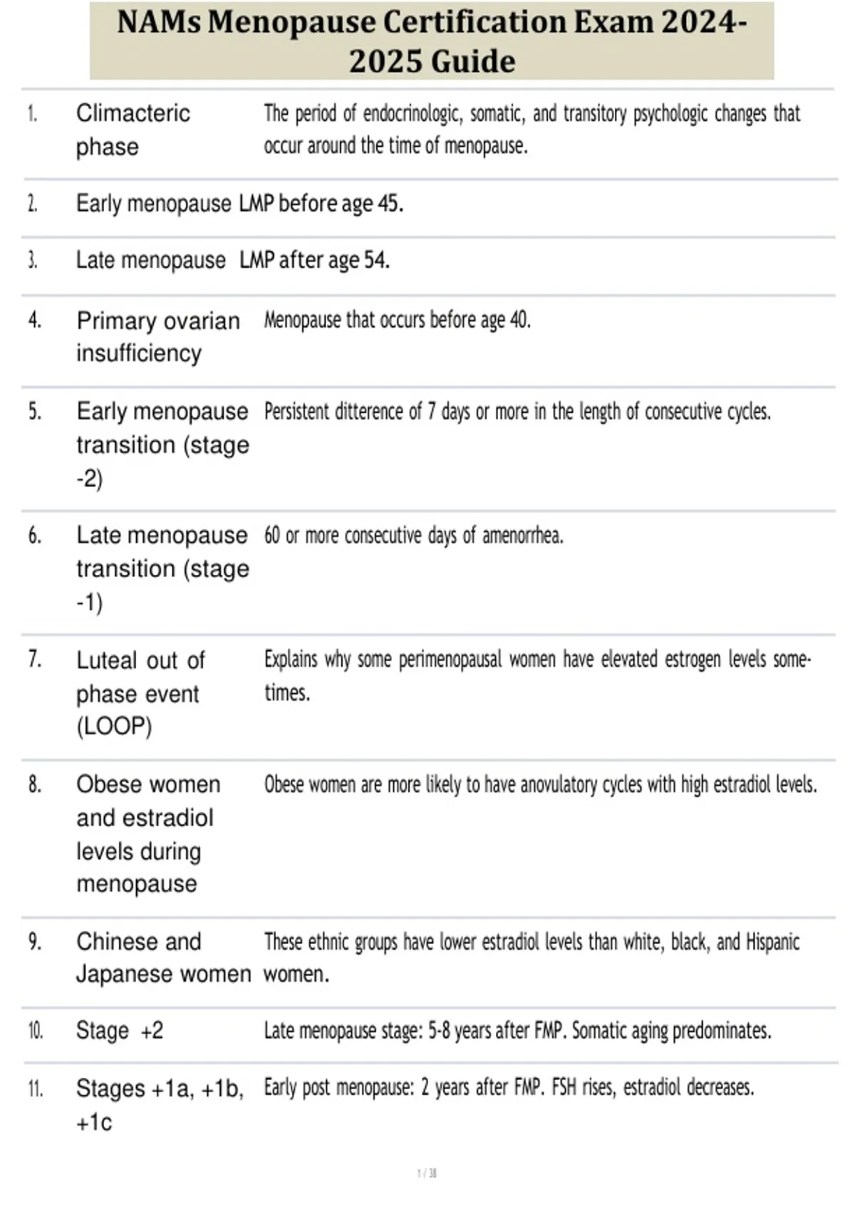 11. Stages +1a, +1b, Early post menopause: 2 years after FMP. FSH rises, estradiol decreases.
