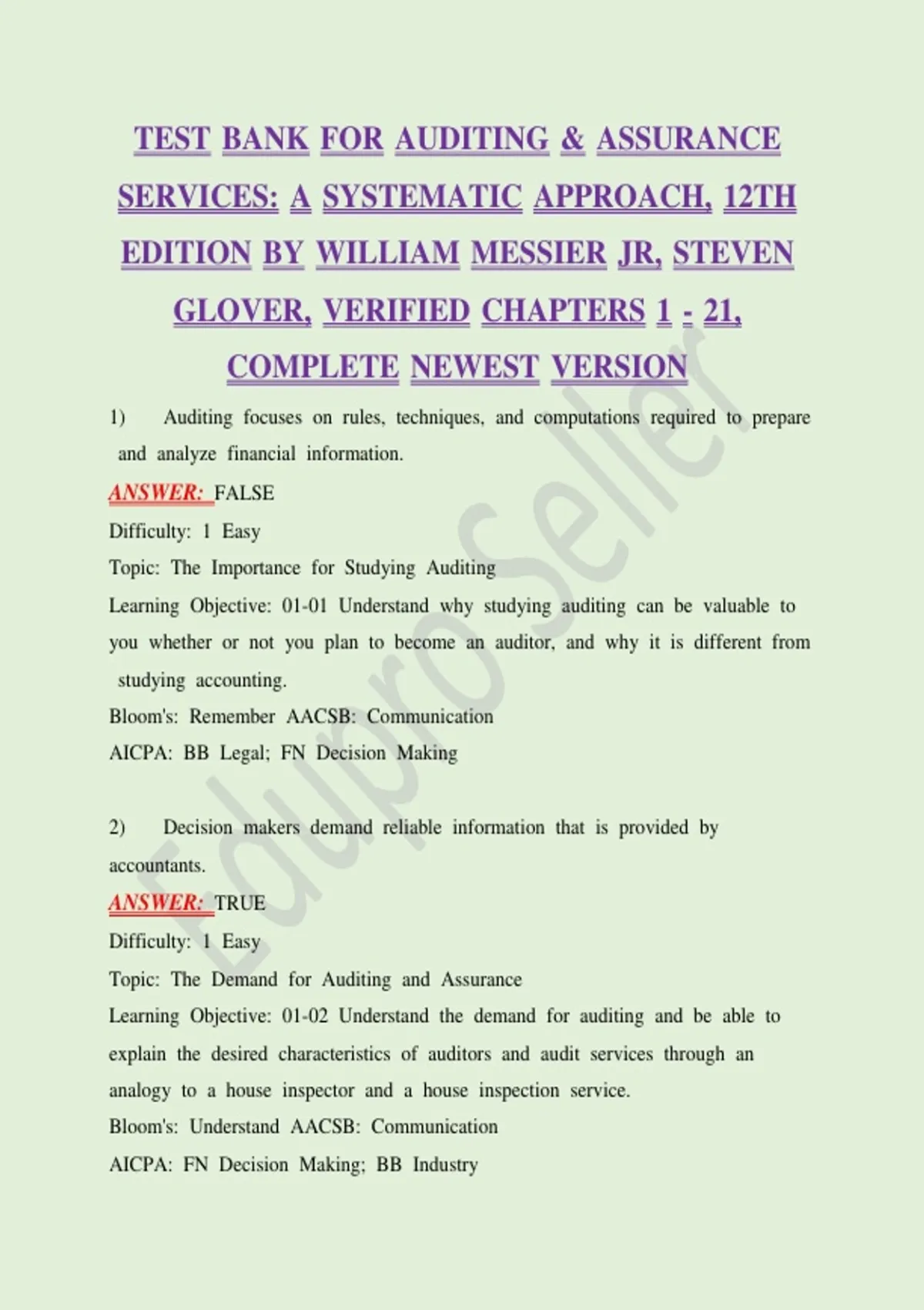 TEST BANK FOR AUDITING & ASSURANCE SERVICES: A SYSTEMATIC APPROACH, 12TH EDITION BY WILLIAM MESSIER JR, STEVEN GLOVER, VERIFIED CHAPTERS 1 - 21, COMPLETE NEWEST VERSION Auditing & Assurance Services: A Systematic Approach 12TH Edition, International edition, Textbook only. Paperback – January 1, 2021 by Douglas F. Prawitt William F. Messier Jr, Steven M. Glover