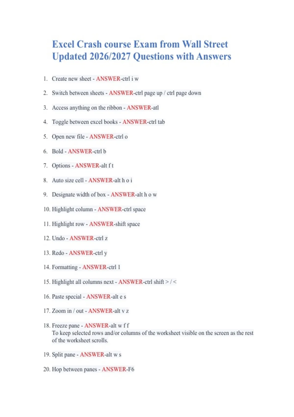 A comprehensive cheat sheet of Excel shortcuts, formulas, and functions from the updated 2026 Wall Street Excel Crash Course. Includes keyboard shortcuts for navigation, formatting, data analysis, financial functions (PV, FV, NPV, IRR), lookup formulas (VLOOKUP, HLOOKUP, MATCH), and productivity tips for professionals in finance, accounting, and business analytics. 1. Create new sheet - ANSWER-ctrl i w 2. Switch between sheets - ANSWER-ctrl page up / ctrl page down 3. Access anything on the ribbon - ANSWER-atl 4. Toggle between excel books - ANSWER-ctrl tab 5. Open new file - ANSWER-ctrl o 6. Bold - ANSWER-ctrl b 7. Options - ANSWER-alt f t 8. Auto size cell - ANSWER-alt h o i 9. Designate width of box - ANSWER-alt h o w 10. Highlight column - ANSWER-ctrl space 11. Highlight row - ANSWER-shift space 12. Undo - ANSWER-ctrl z 13. Redo - ANSWER-ctrl y 14. Formatting - ANSWER-ctrl 1 15. Highlight all columns next - ANSWER-ctrl shift > / < 16. Paste special - ANSWER-alt e s 17. Zoom in / out - ANSWER-alt v z 18. Freeze pane - ANSWER-alt w f f To keep selected rows and/or columns of the worksheet visible on the screen as the rest of the worksheet scrolls. 19. Split pane - ANSWER-alt w s 20. Hop between panes - ANSWER-F6