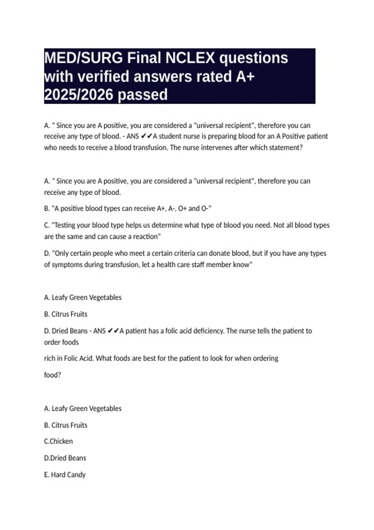 D. Dried Beans - ANS ✔✔A patient has a folic acid deficiency. The nurse tells the patient to