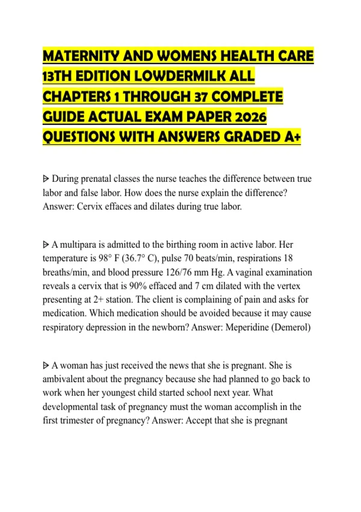 MATERNITY AND WOMENS HEALTH CARE 13TH EDITION LOWDERMILK ALL CHAPTERS 1 THROUGH 37 COMPLETE GUIDE ACTUAL EXAM PAPER 2026 QUESTIONS WITH ANSWERS GRADED A+