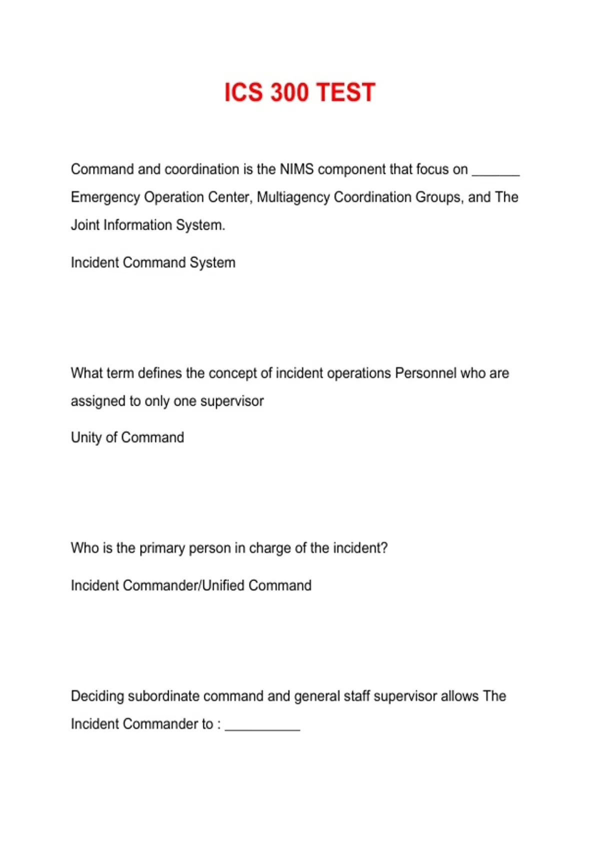 Prepare and excel with ICS 300 Test 2025/2026 with Solution, featuring complete questions and answers to master the Incident Command System and improve emergency management performance.