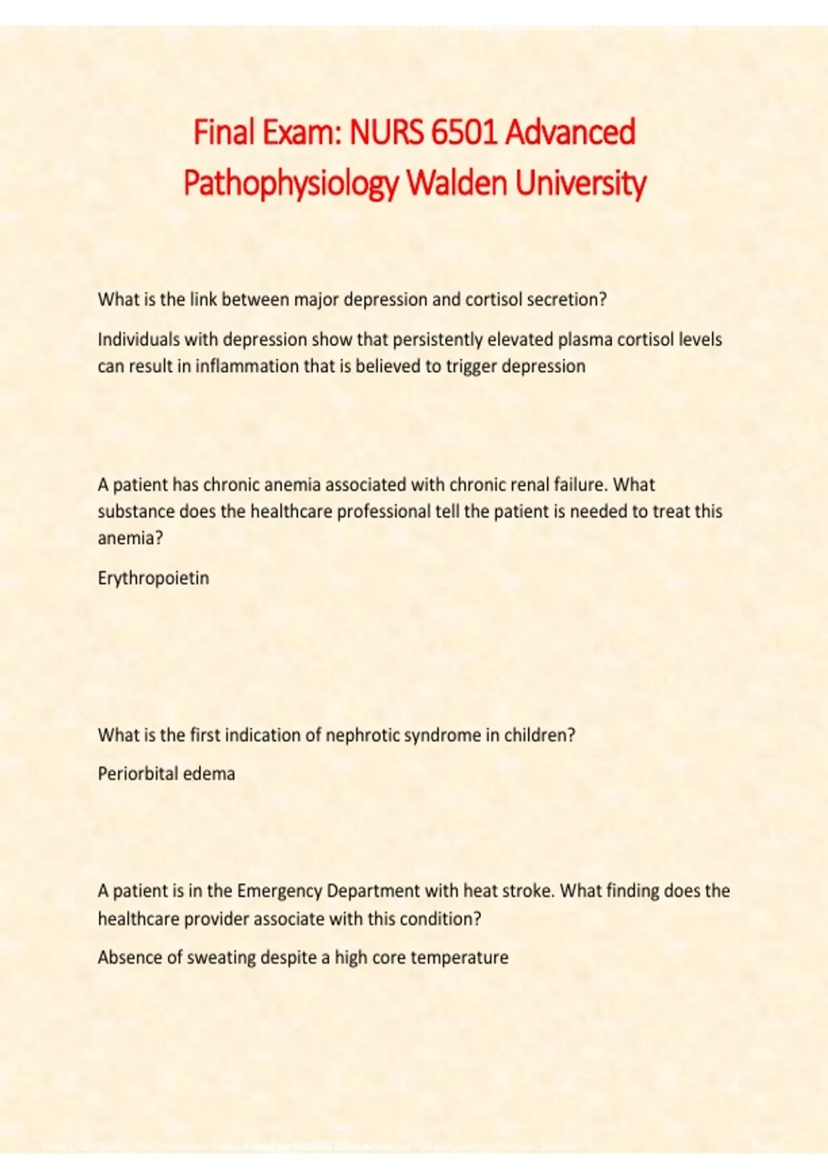 Prepare and excel in NURS 6501 Advanced Pathophysiology Final Exam Walden University 2025/2026 with Solution, featuring complete questions and answers to master complex pathophysiology concepts and achieve top exam performance.