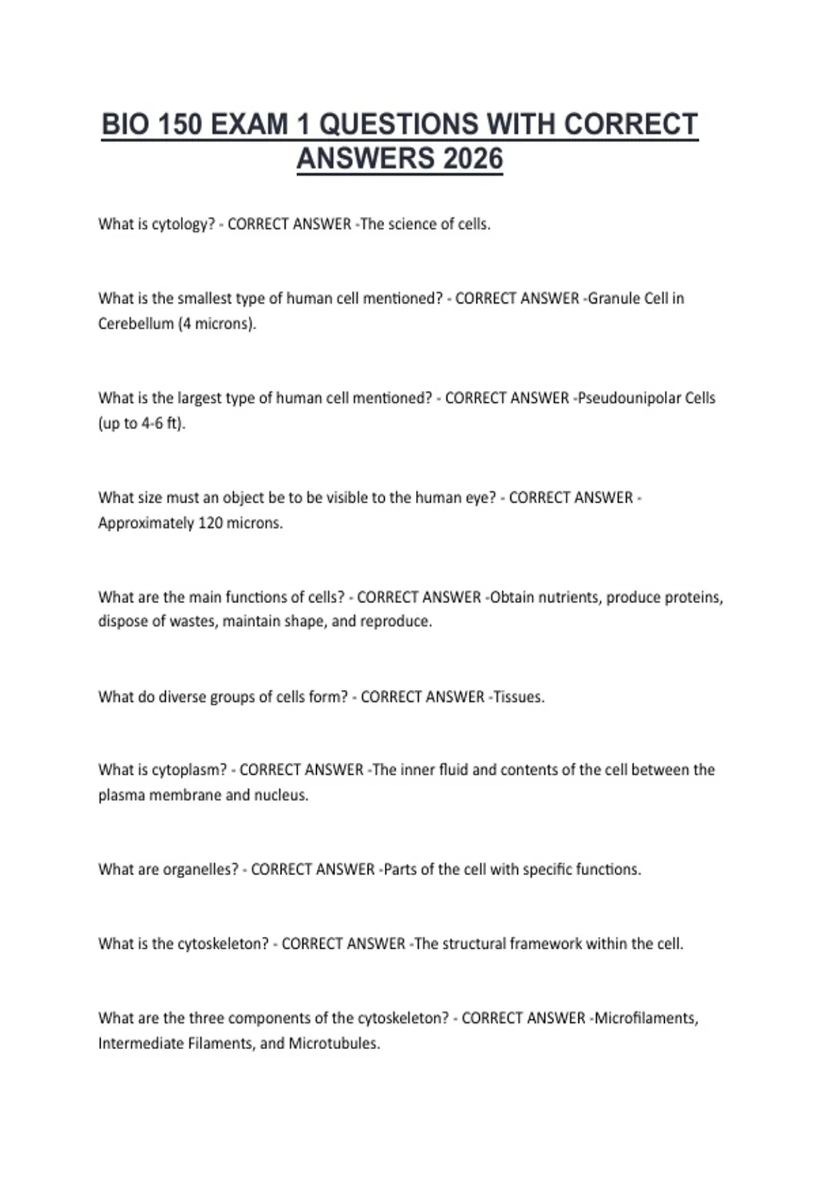 BIO 150 EXAM 1 QUESTIONS WITH CORRECT ANSWERS 2026