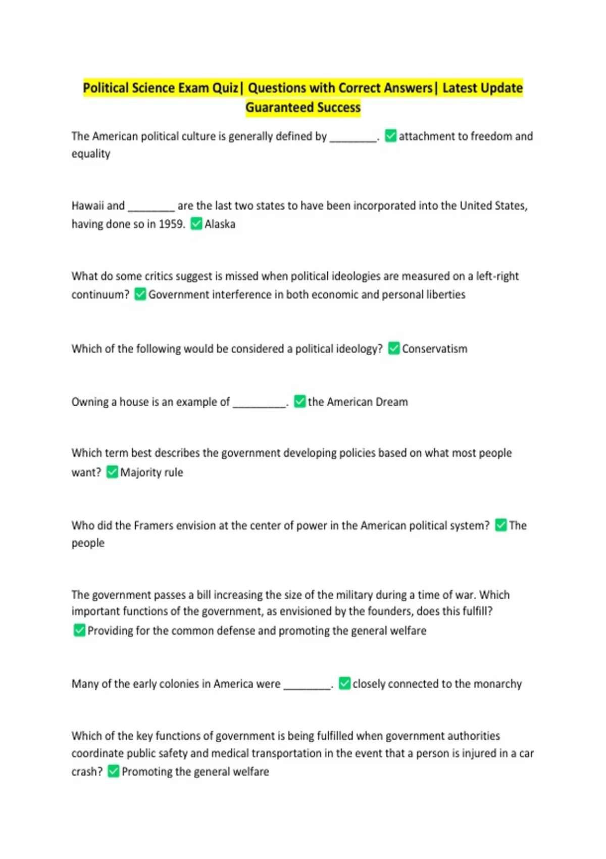 Political Science Exam Quiz| Questions with Correct Answers| Latest Update