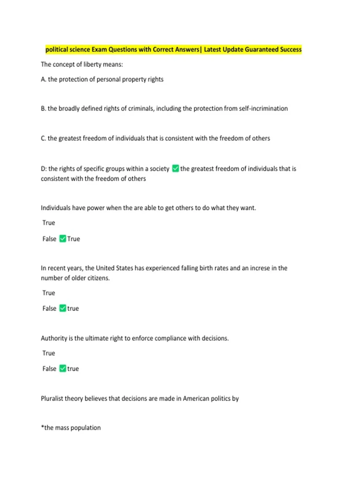 political science Exam Questions with Correct Answers| Latest Update Guaranteed Success