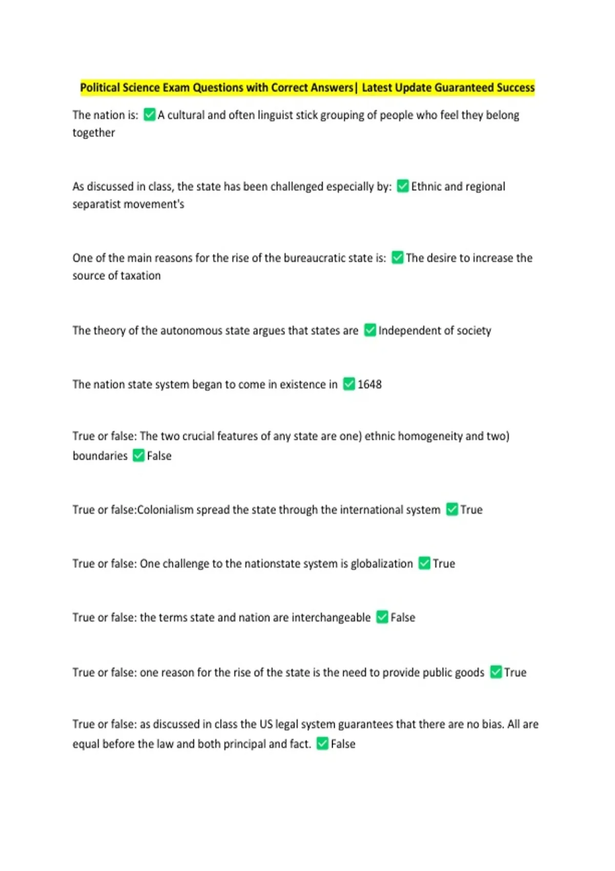 Political Science Exam Questions with Correct Answers| Latest Update Guaranteed Success