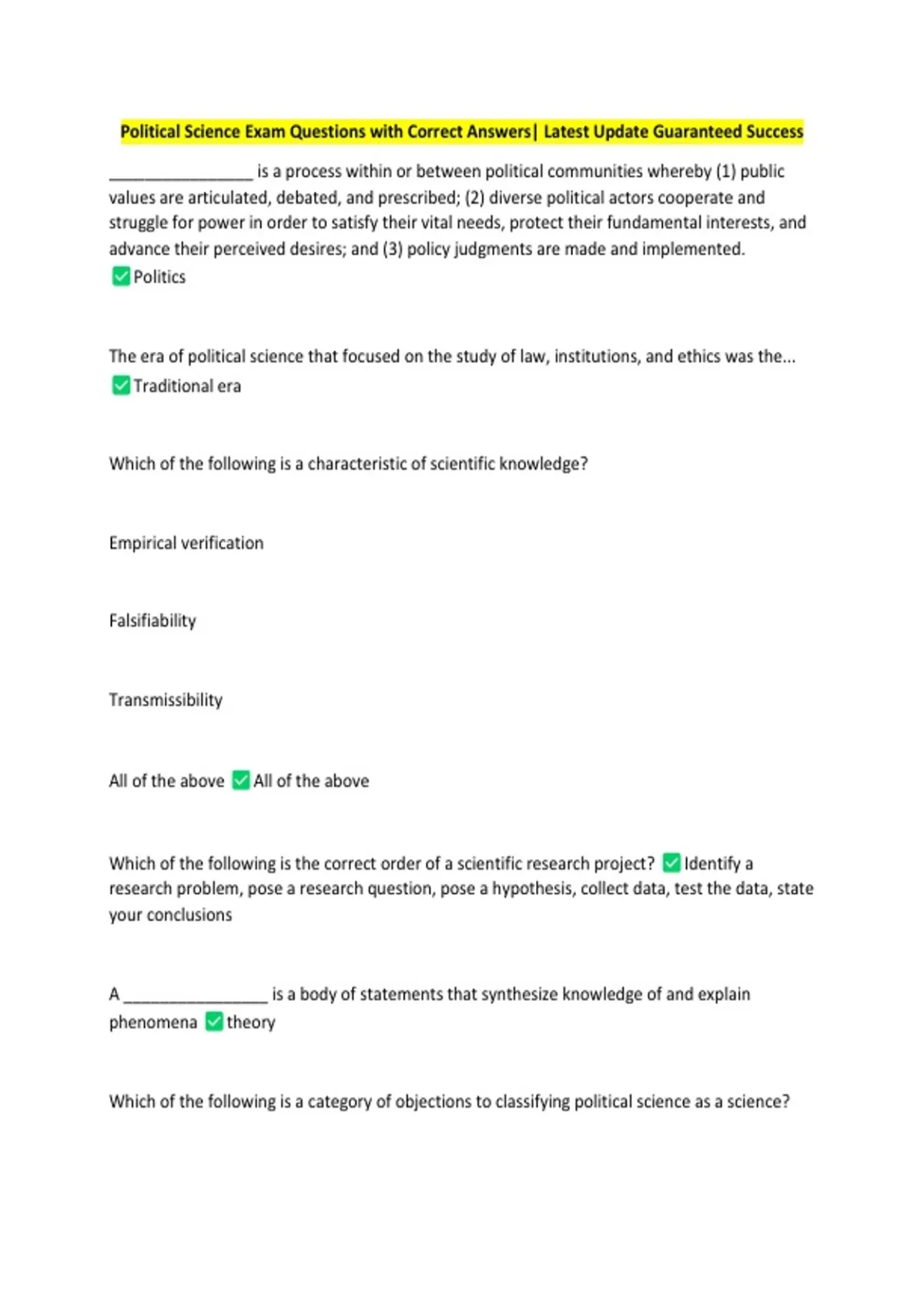 Political Science Exam Questions with Correct Answers| Latest Update Guaranteed Success