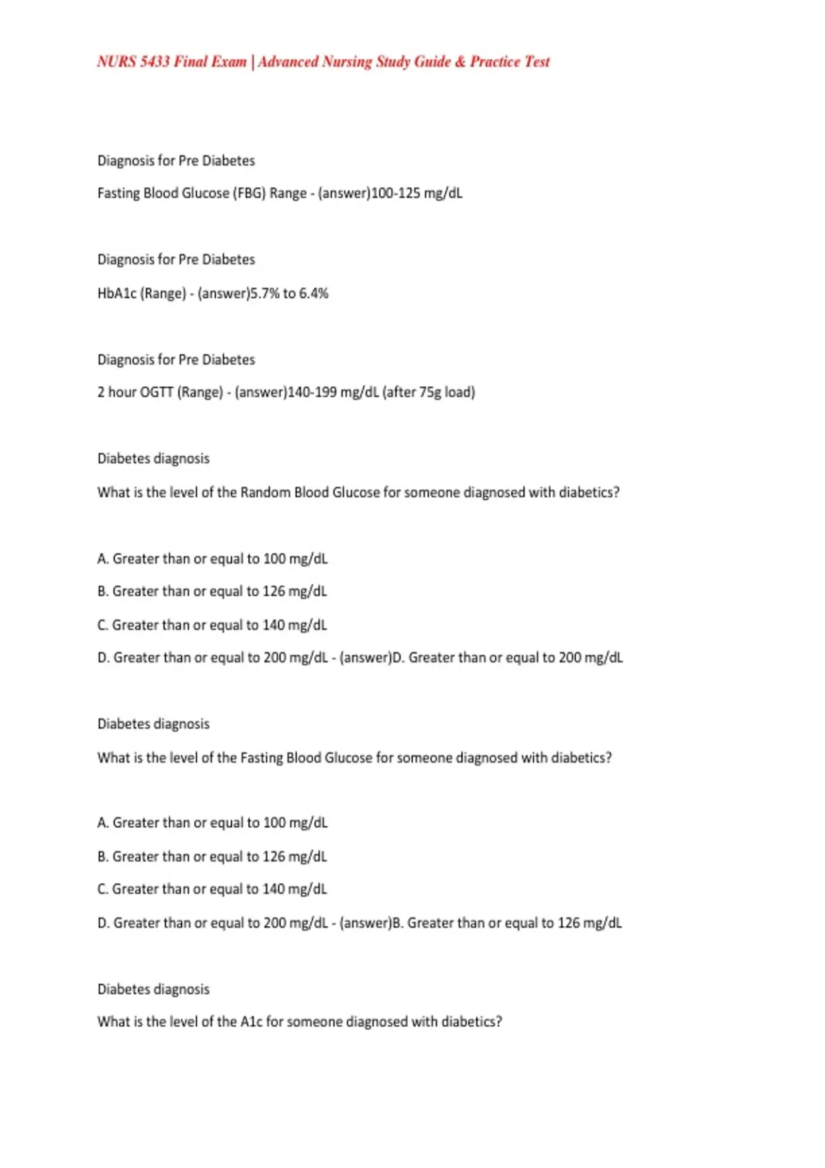 D. Greater than or equal to 200 mg/dL - (answer)B. Greater than or equal to 126 mg/dL