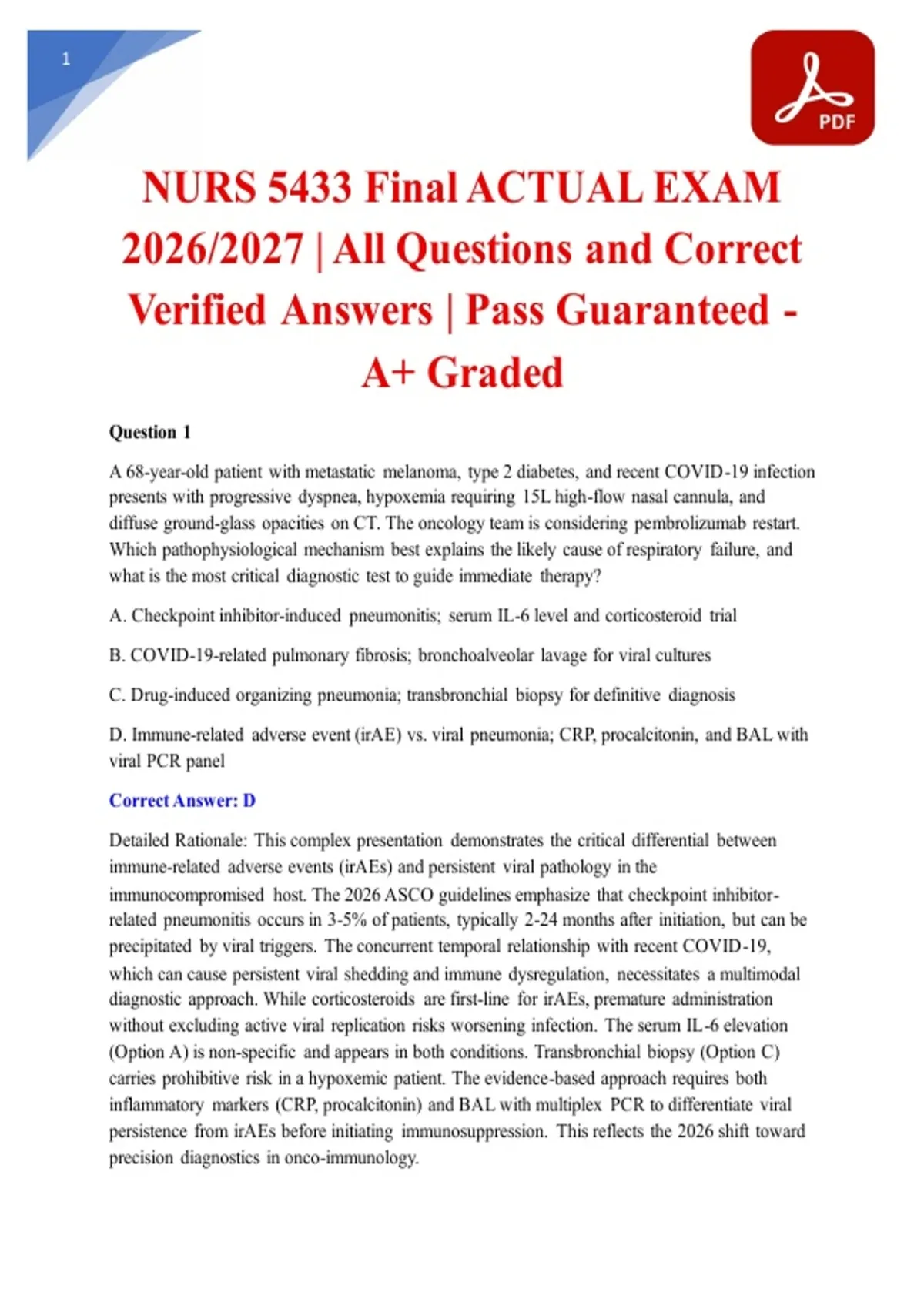 PASS THE NURS 5433 FINAL WITH THE REAL EXAM! This A+ Graded resource contains the NURS 5433 Final Actual Exam (2026/2027). Featuring All Questions and Correct Verified Answers, this guide provides comprehensive coverage of advanced nursing concepts tailored to your course's objectives. With detailed rationales for each solution, it mirrors the exact format, depth, and complexity of the proctored final assessment. Ensure your success and approach the exam with total confidence backed by our Pass Guarantee. Download the definitive exam bank now.
