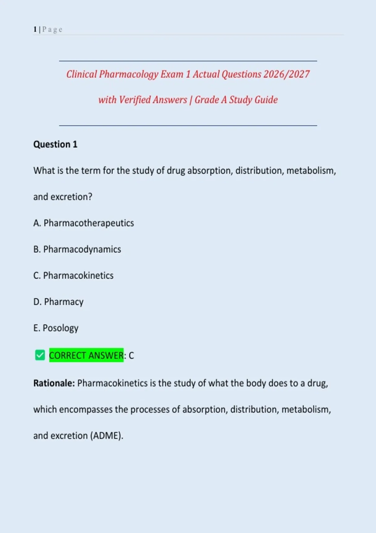 Clinical Pharmacology Exam 1 Actual Questions 2026/2027 with Verified Answers | Grade A Study Guide