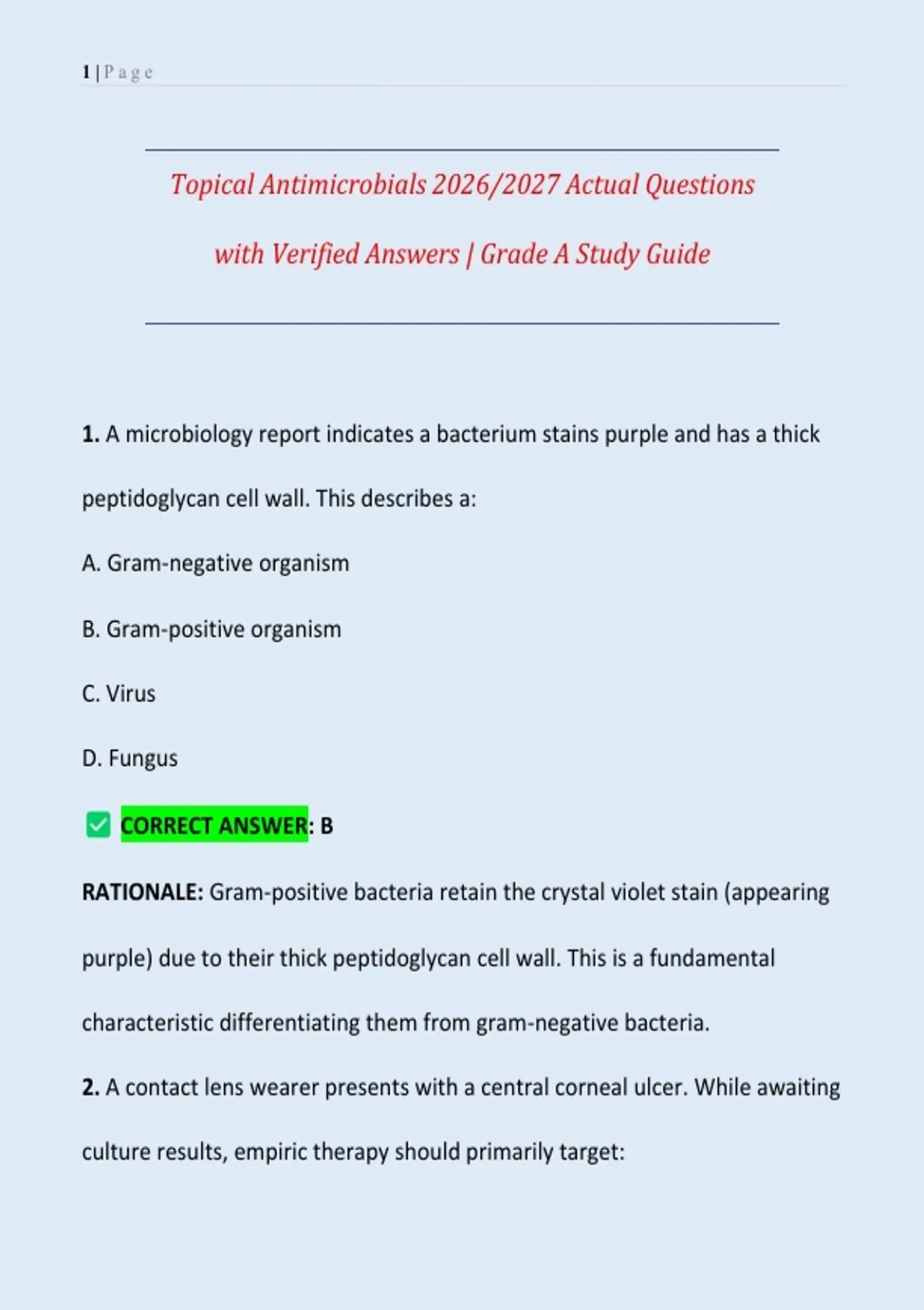 1. A microbiology report indicates a bacterium stains purple and has a thick