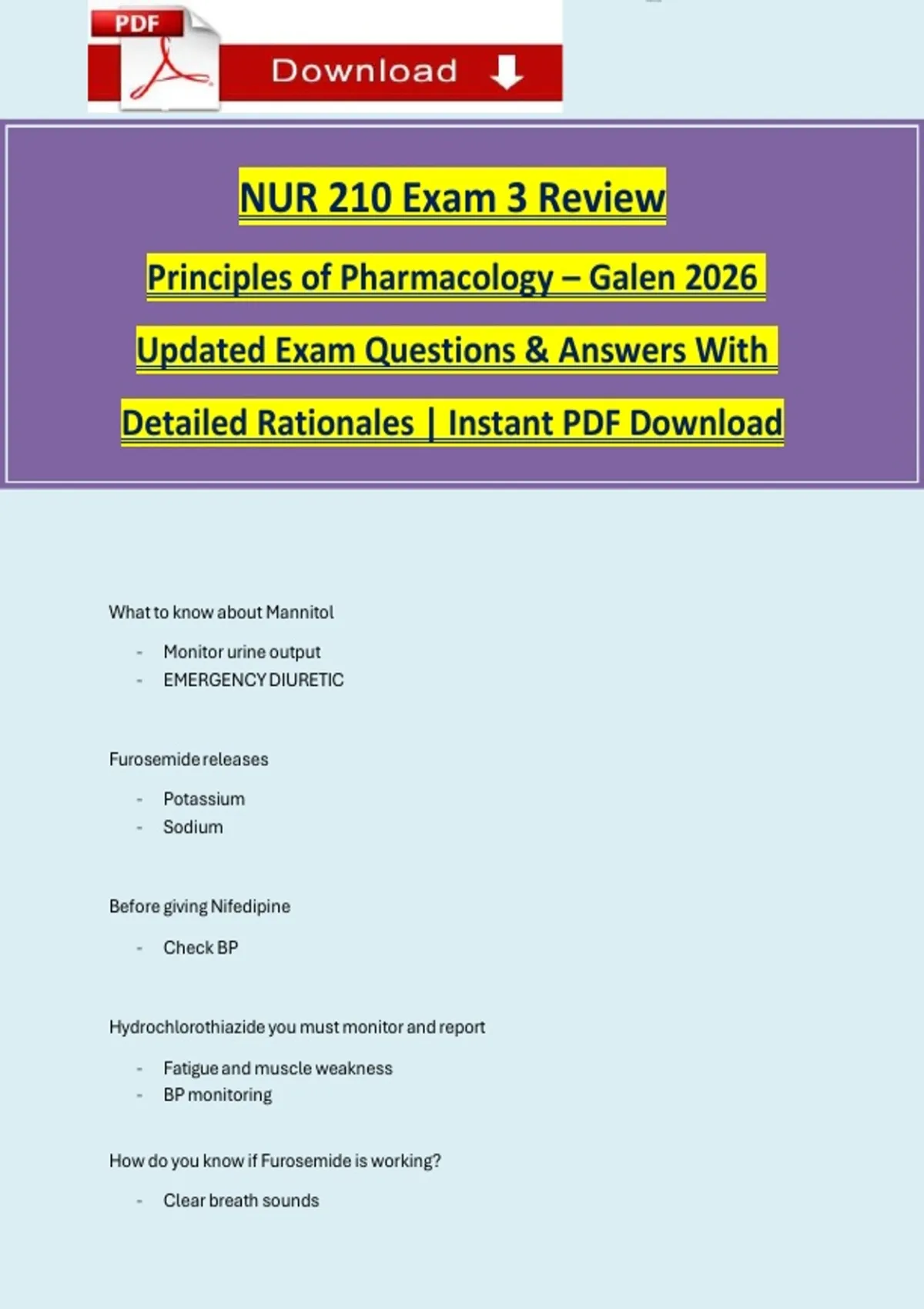 NUR 210 Exam 3 Review Principles of Pharmacology – Galen 2026 Updated Exam Questions & Answers With Detailed Rationales | Instant PDF Download