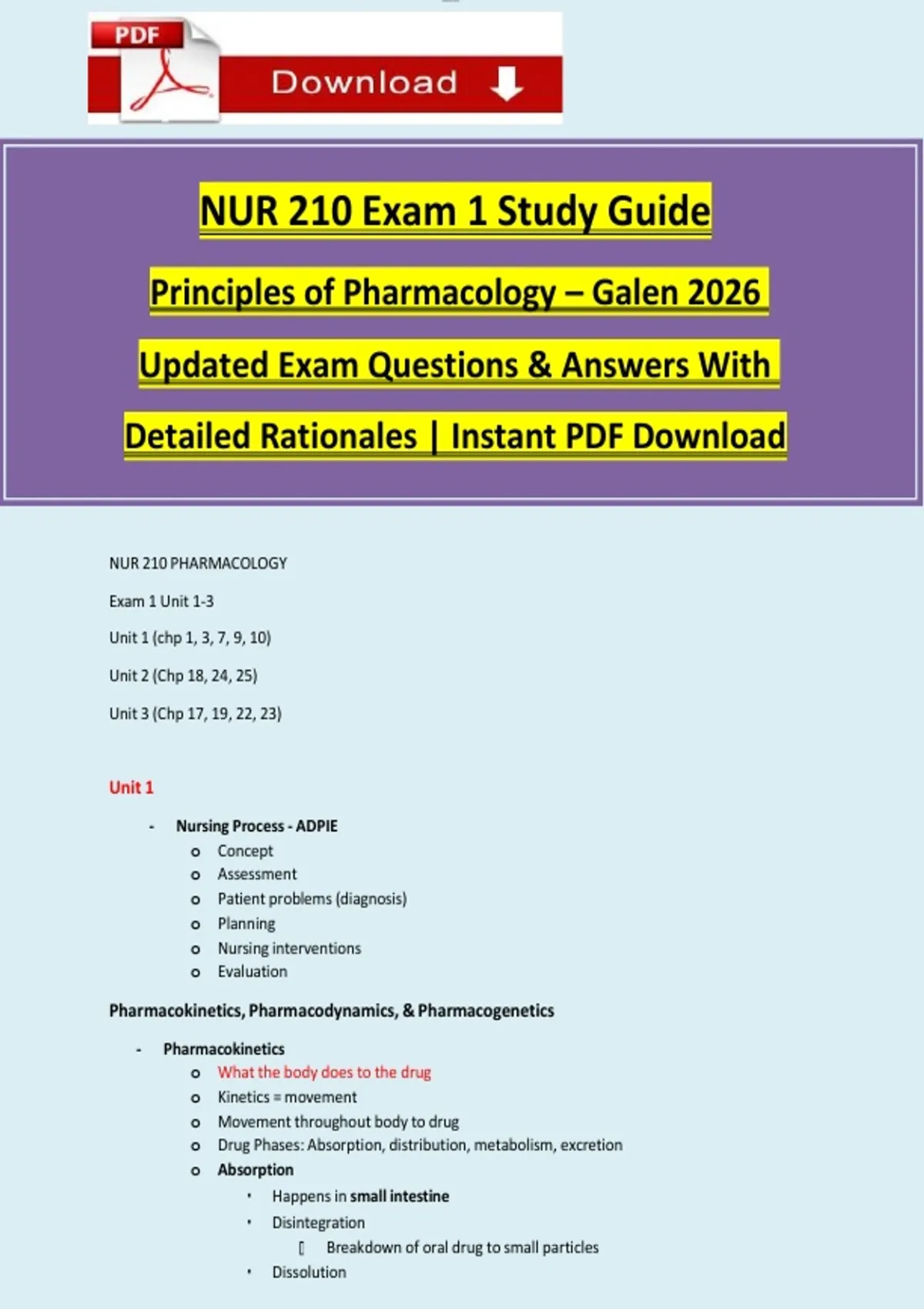 NUR 210 Exam 1 Study Guide Principles of Pharmacology – Galen 2026 Updated Exam Questions & Answers With Detailed Rationales | Instant PDF Download