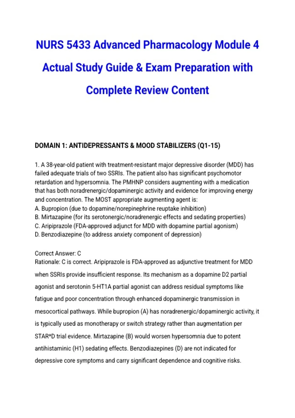 Comprehensive NURS 5433 Advanced Pharmacology Module 4 study guide designed for graduate nursing students. This complete review resource covers specialized pharmacotherapeutics including psychotropic medications, neurological agents, antimicrobial therapies, and complex medication management scenarios. Features detailed drug classifications, mechanisms of action, clinical applications, monitoring parameters, and evidence-based prescribing guidelines. Perfect for mastering advanced pharmacological concepts required for Module 4 examinations and clinical decision-making in graduate nursing education.