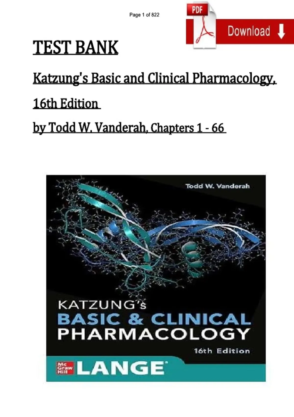 TEST BANK For Katzung's Basic and Clinical Pharmacology, 16th Edition By {Todd W. Vanderah, 2024,} Verified Chapters 1 - 66, Complete Newest Version