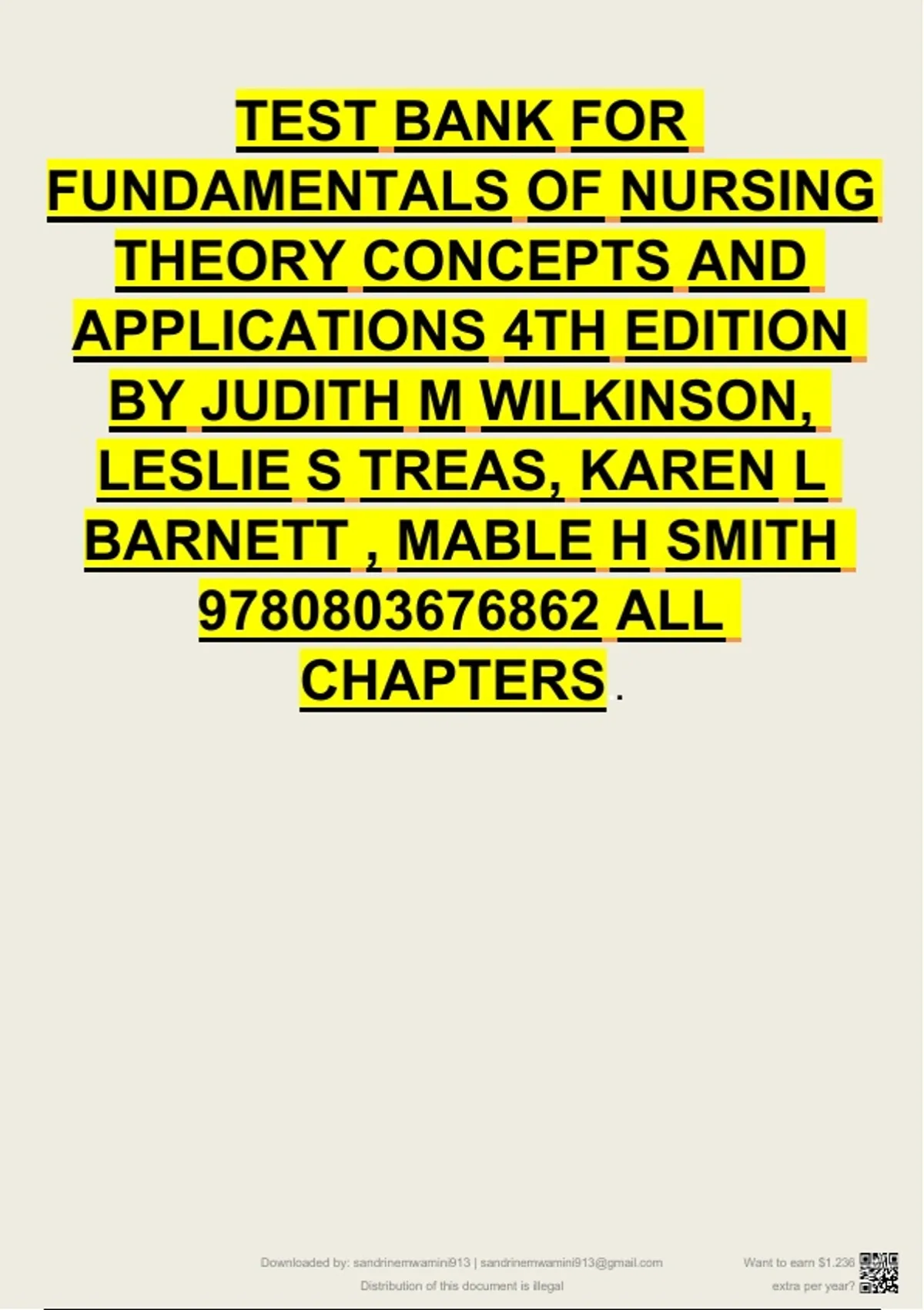 TEST BANK FOR FUNDAMENTALS OF NURSING THEORY CONCEPTS AND APPLICATIONS 4TH EDITION BY JUDITH M WILKINSON, LESLIE S TREAS, KAREN L BARNETT , MABLE H SMITH 9780803676862 ALL CHAPTERS