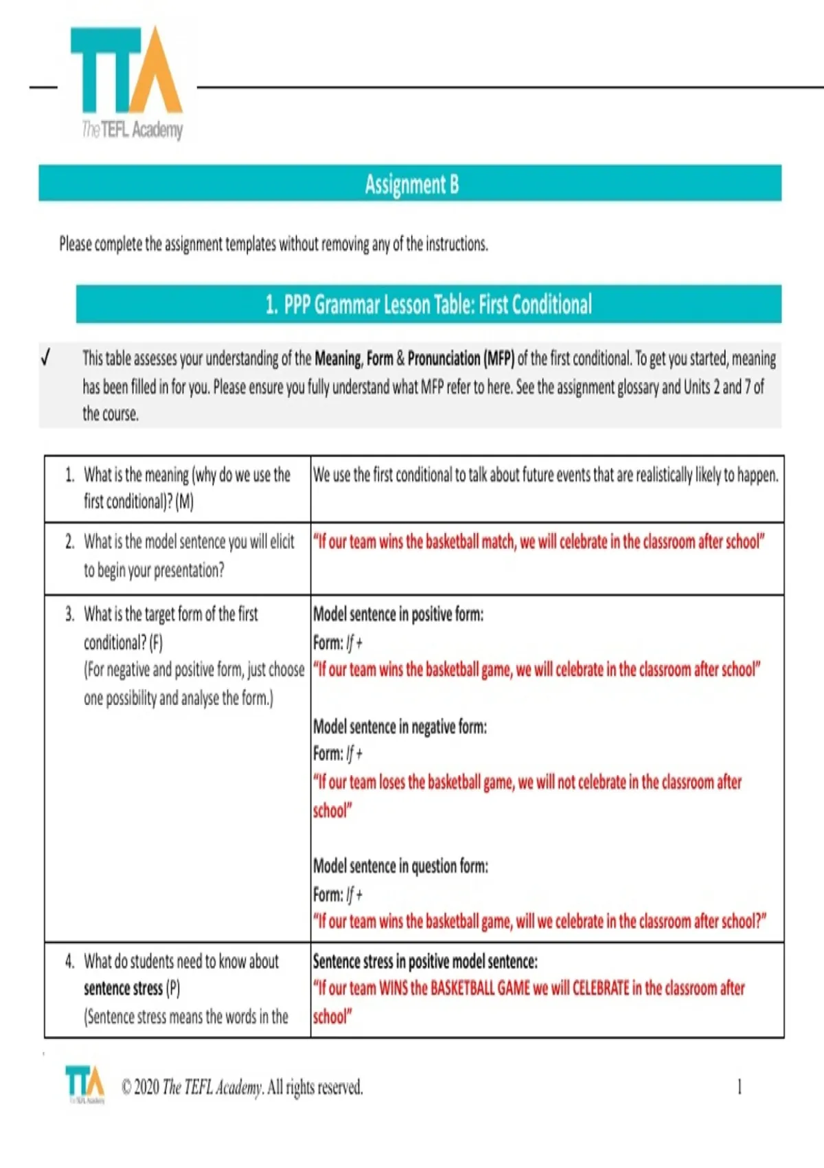 ✔ This table assesses your understanding of the Meaning, Form & Pronunciation (MFP) of the first conditional. To get you started, meaning